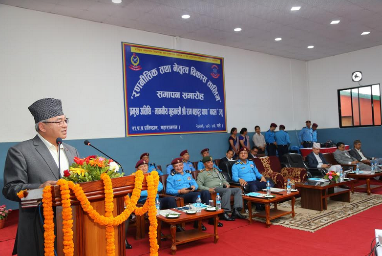 कार्यक्रममा प्रशिक्षार्थीहरुलाई प्रमाणपत्र वितरण पश्वात गृहमन्त्री थापाले तालिमको मुख्य लक्ष्य सफल, सक्षम नेतृत्व एवम् व्यावसायिक सुरक्षा अधिकृत निर्माण गर्नु रहेको चर्चा गर्दै तालिमबाट प्राप्त नेतृत्व विकास सम्बन्धी सिद्धान्त तथा विबिध ज्ञानले देश र जनताको सुरक्षामा महत्वपूर्ण योगदान मिल्ने विश्वास व्यक्त गरे ।