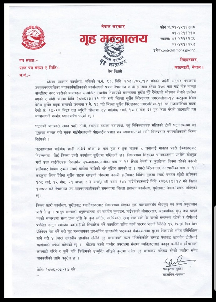 काठमाडौं – गृहमन्त्रालयले नेपालगञ्जबाट ल्याइएका गाईगोरु बाटोमै मृत्यु भएको घटनाको छानविन थालेको छ । मन्त्रालयका उपसचिव सागरमणि पाठकको संयोजकत्वमा चार सदस्यीय छानविन समिति बनाएको मन्त्रालयले जनाएको छ ।