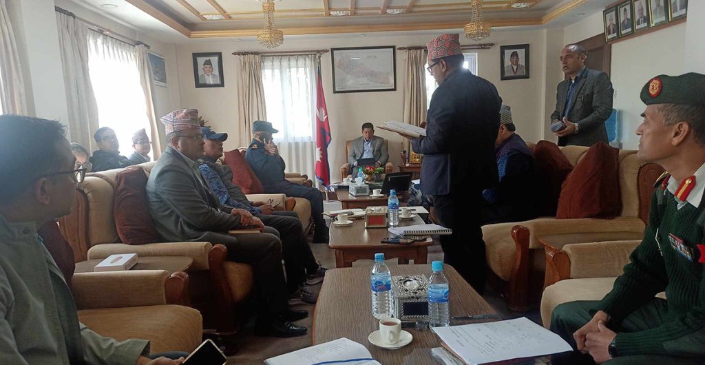 गृह मन्त्रालयमा प्रधानमन्त्री तथा मनित्रपरिषदको कार्यालय, सुरक्षा निकायका प्रमुखहरु, स्वास्थ मन्त्रालय, संघीय मामिला मन्त्रालय, परराष्ट्र मन्त्रालय, भौतिक पूर्वाधार तथा यातायात मन्त्रालय र नेपाली सेनाका प्रतिनिधिहरुको बैठक सुरु भएको हो ।