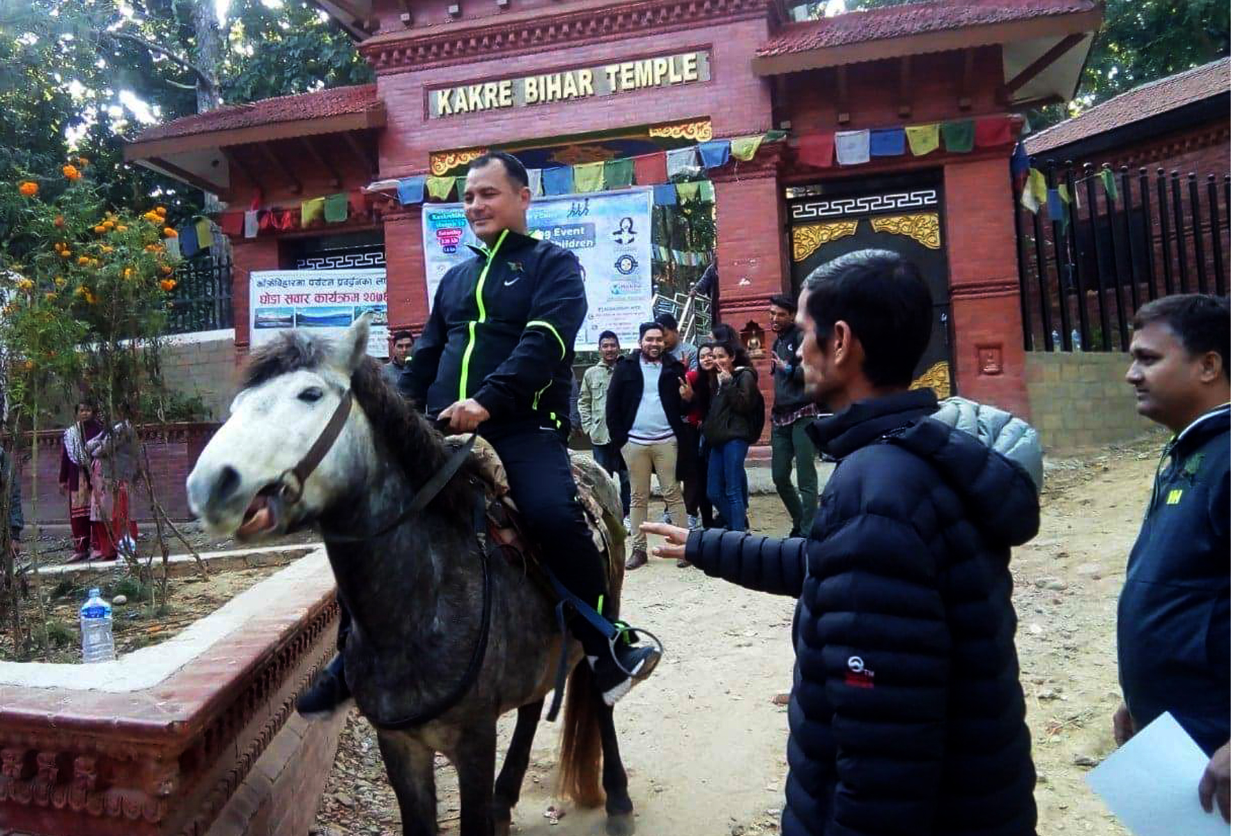 कर्णाली – कर्णालीको उद्योग, पर्यटन, वन तथा वातावरणमन्त्री नन्दसिं बुढा शनिबार कांक्रेविहारमा घोडा सवार गर्दै । पर्यटन प्रवद्र्धन गर्ने उद्देश्यका साथ स्वयंसेवी युवा समूह ‘तनाव छ जिन्दगी फाउन्डेसन’ले कांक्रेविहारमा दौड आयोजना गरेको हो । तस्वीर : प्रकाश अधिकारी/रासस