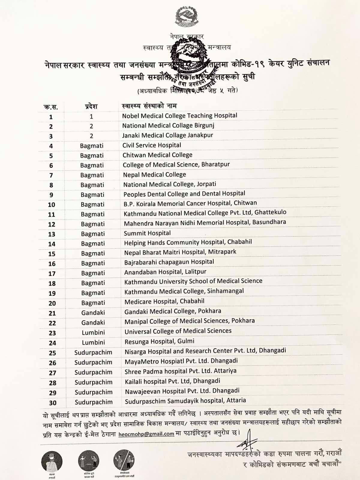 सातै प्रदेशका विभिन्न ३० वटा निजी अस्पताल तथा मेडिकल कलेजहरुले कोरोना संक्रमितको निःशुल्क उपचारका लागि सम्झौता गरेको मन्त्रालयले जारी गरेको विज्ञप्तिमा उल्लेख छ ।