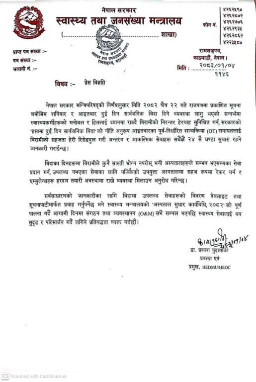 यसअघि स्वास्थ्य तथा जनसंख्या मन्त्रालयले अस्पतालमा २ दिन बिदा दिँदा बिरामी मर्कामा पर्ने भन्दै अस्पतालहरुलाई आइतबार पनि ओपीडी खुला गर्न आग्रह गरेको थियो ।
