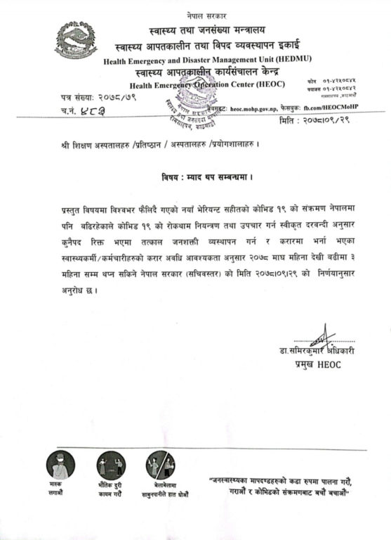 त्यस्तै करारमा भर्ना भएका स्वास्थ्यकर्मी/ कर्मचारीहरुको करार अवधि आवश्यकता अनुसार २०७८ माघ महिनादेखि बढीमा ३ महिनासम्म थप्प सकिने केन्द्रले जनाएको छ ।