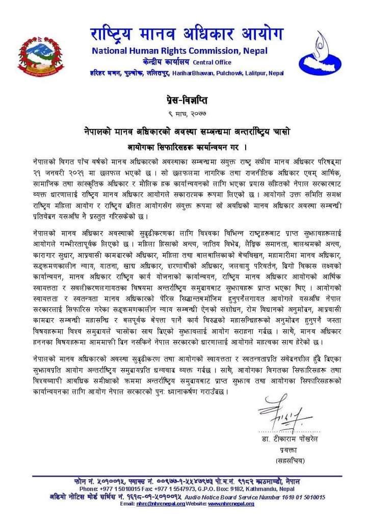 आयोगका प्रवक्ता डा. टिकाराम पोखरेलले शुक्रबार एक विज्ञप्ति जारी गर्दै विगतका सिफारिस तथा विश्वव्यापी आवधिक समीक्षाको क्रमममा अन्तराष्ट्रिय समुदायबाट प्राप्त सुझाव तथा अयाोगका सिफारिसहरुको कार्यान्वयनका लागि सरकारको ध्यानआकर्षण गराएका छन् ।