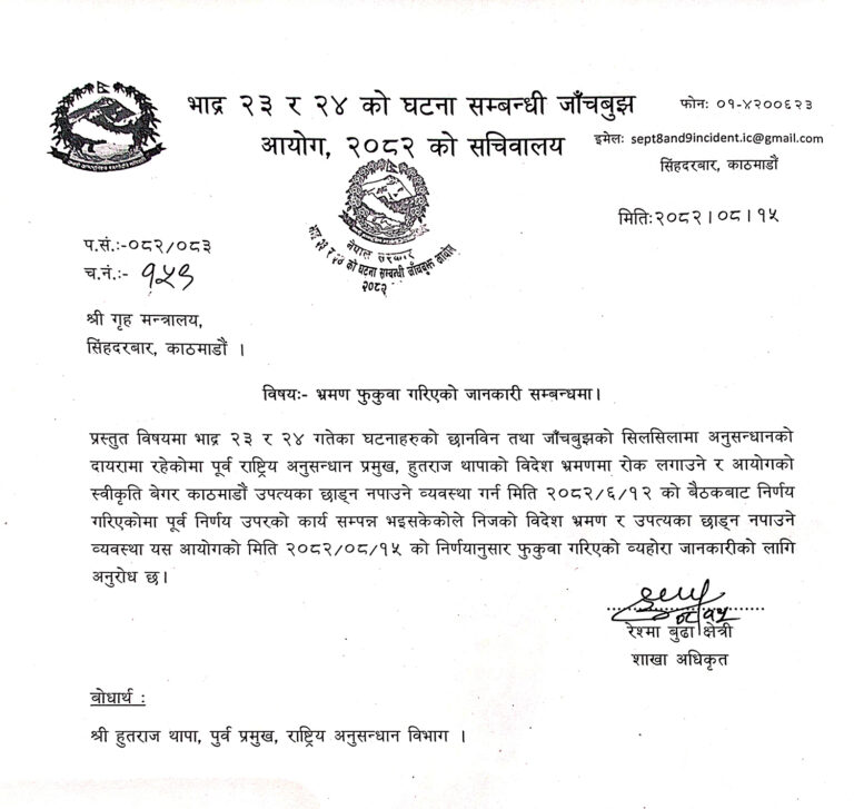 काठमाण्डु – भदौ २३ र २४ गतेका घटनाबारे छानबिन गर्न बनेको जाँचबुझ आयोगले पूर्व राष्ट्रिय अनुसन्धान प्रमुख हुतराज थापामाथि लगाइएको विदेश भ्रमण प्रतिबन्ध हटाएको छ ।
