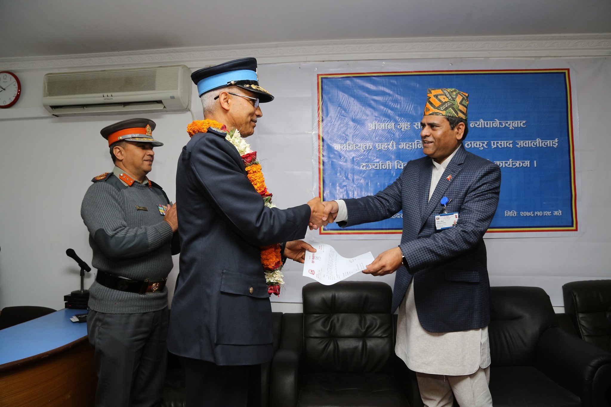 गृहसचिव महेश्वर न्यौपानेको हातबाट प्रहरी महानिरीक्षक ज्ञवालीले दर्ज्यानी चिन्ह पाएपछि उनी कार्यभार सम्हाल्न र स्वागत कार्यक्रममा सहभागी हुन प्रहरी मुख्यालय नक्साल पुगेका थिए ।