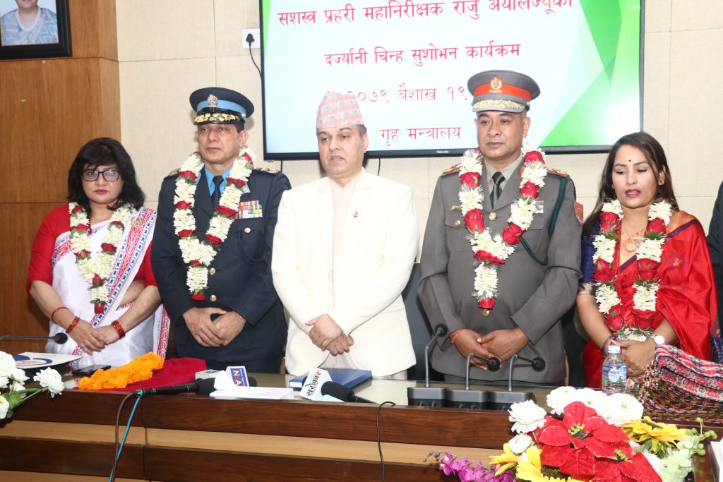 सोमबार मन्त्रालयमा आयोजित समारोहमा गृह मन्त्रालयका सचिव टेक नारायण पाण्डेले नेपाल प्रहरीका आईजीपी सिंह र सशस्त्रका अर्याललाई दर्ज्यानी चिह्न ‘फुली’ लगाइदिएका हुन् ।