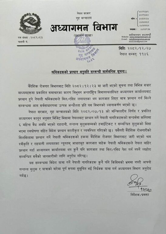 अब त्रिभुवन अन्तर्राष्ट्रिय विमानस्थलस्थित अध्यागमन कार्यालयबाट प्रस्थान गर्ने श्रमिकहरूले अनावश्यक रूपमा विल, रसिद वा अन्य थप कागजात बोक्नु नपर्ने विभागले स्पष्ट पारेको छ । वैदेशिक रोजगारीमा जाने नेपालीका लागि श्रम स्वीकृति, राहदानी जस्ता आधारभूत कागजात भए पुग्ने जनाइएको छ ।