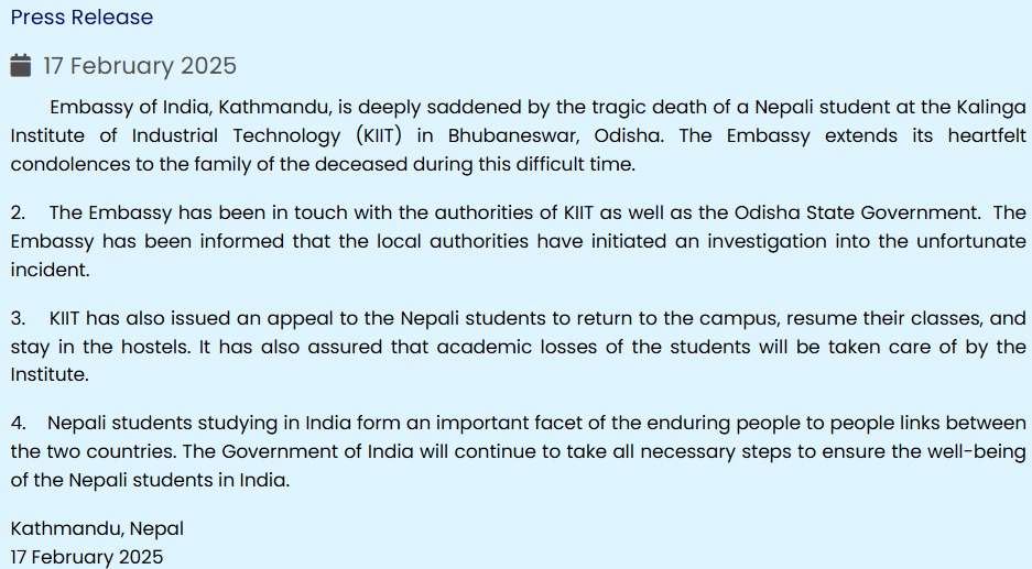 भारतको उडिसा भुवनेश्वरस्थित कलिंगा इन्स्टिच्यूट अफ इन्डस्ट्रियल टेक्नोलोजी (केआईआईटी) को छात्राबासमा नेपाली छात्रा रुपन्देहीकी प्रकृति लम्सालको शंकास्पद मृत्युपछि विकासित घटनाक्रमका सन्दर्भमा दूतावासले सोमबार विज्ञप्ति जारी गरेको छ ।