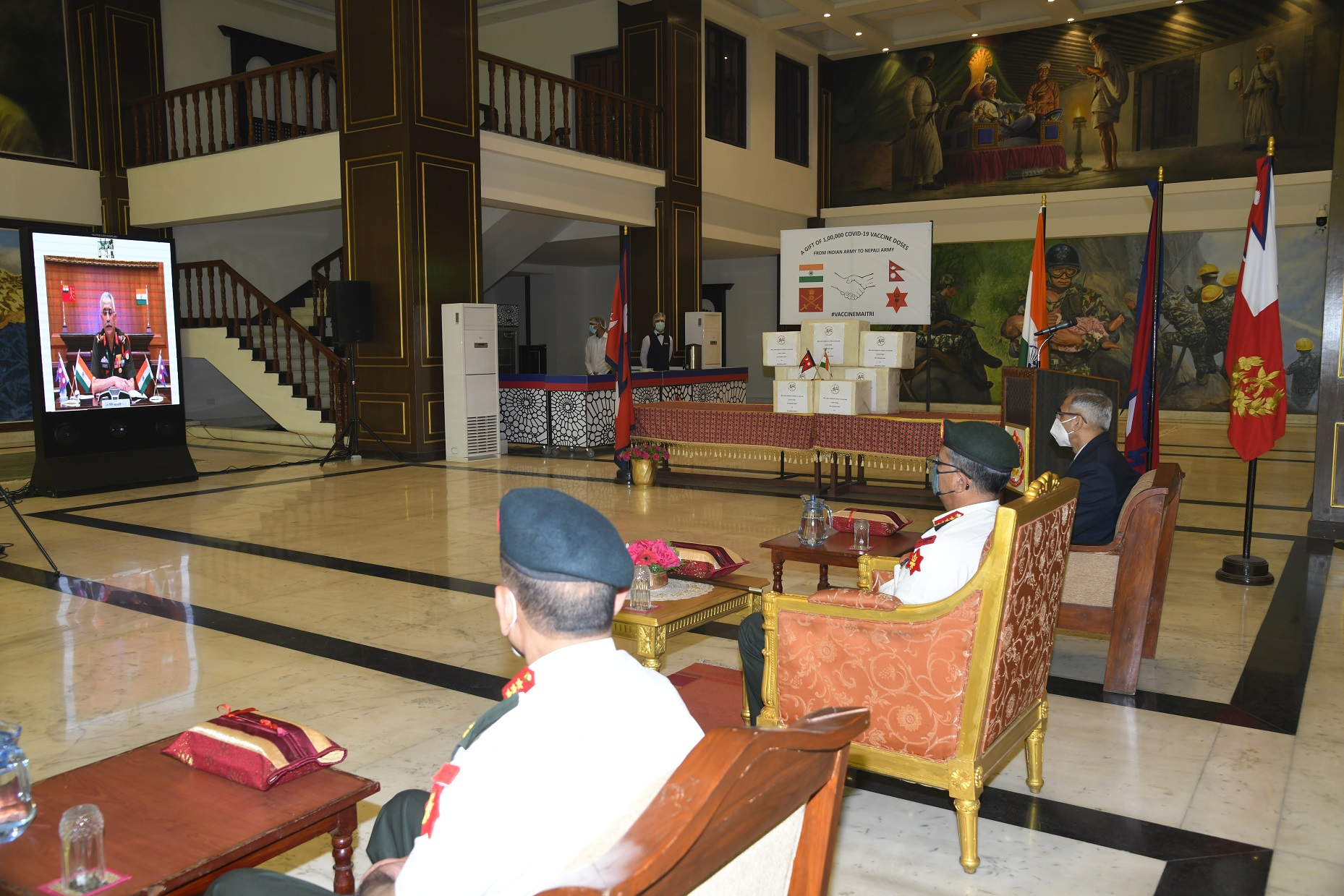 कार्यक्रममा भारतीय सेनाका प्रमुख मनोज मुकुन्द नरवाणेले भिडियो कन्फरेन्समार्फत उक्त खोप प्रधानसेनापति थापालाई ग्रहण गर्न अनुरोध गरेका थिए। त्यसलगत्तै भारतीय राजदूत क्वात्राले खोप हस्तान्तरण गरेका थिए।