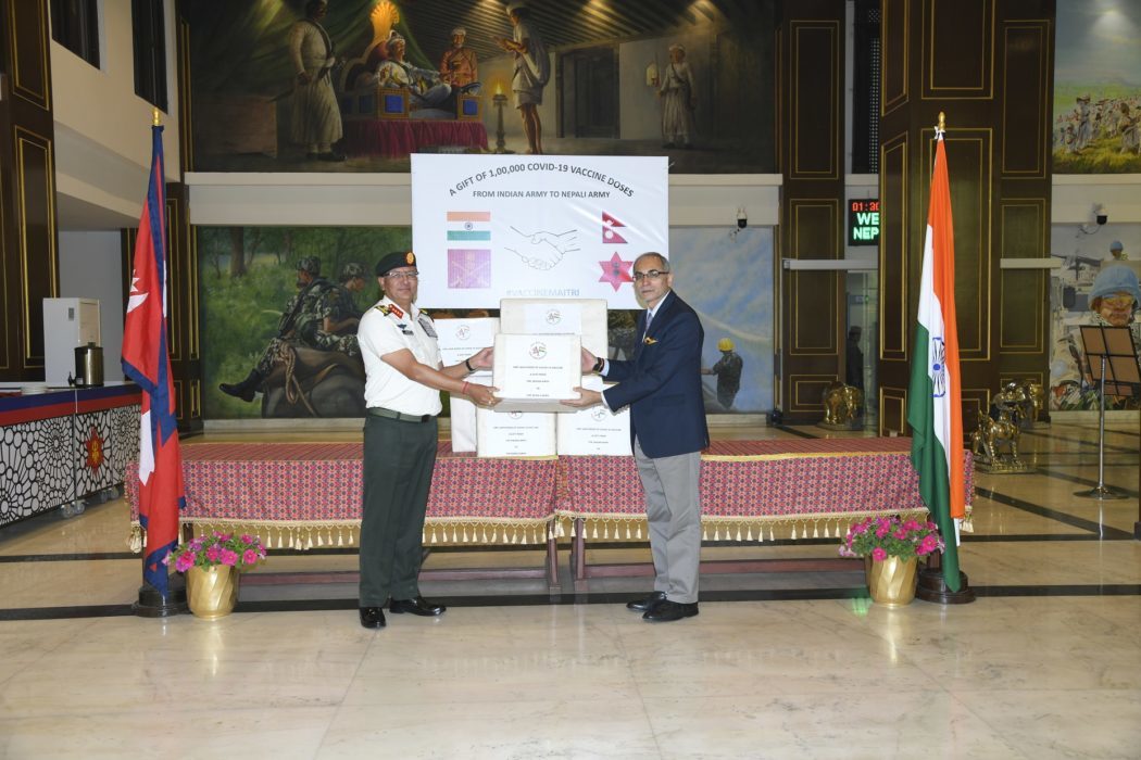 काठमाण्डु – भारतीय सेनाले नेपाली सेनालाई सहयोगस्वरुप प्रदान गरेको एक लाख डोज कोरोना विरुद्धको खोप ‘कोभिशिल्ड’ मध्ये पहिलो खेपको खोप हस्तान्तरण गरेकाे छ।