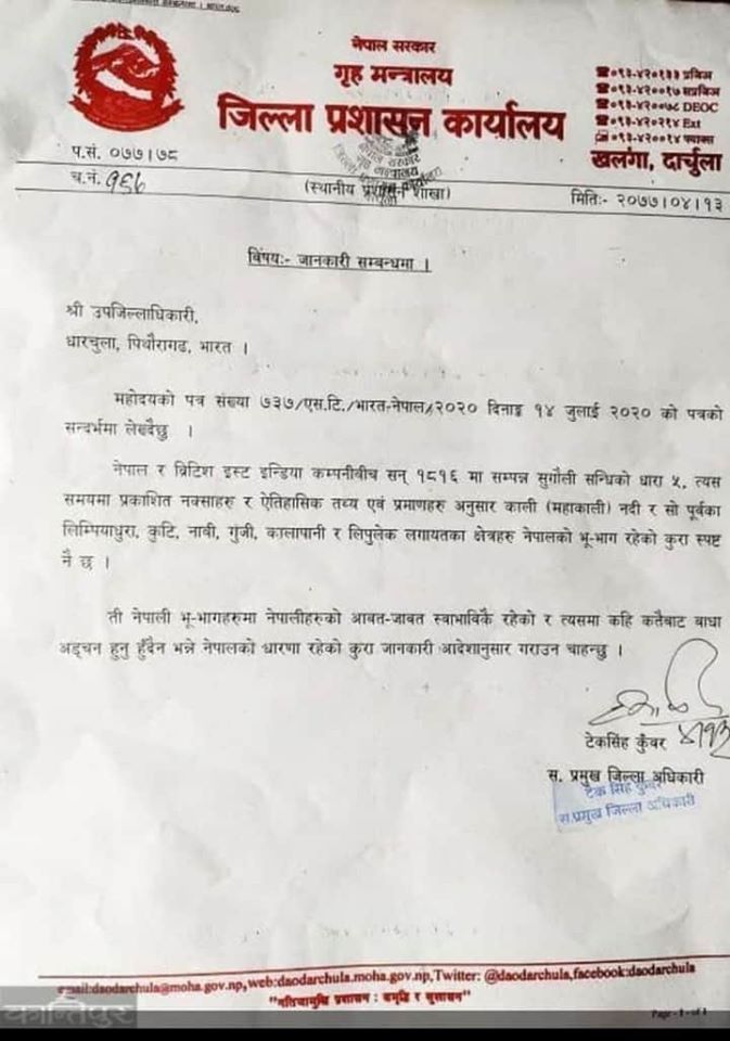 भारतले कालापानी, लिम्पियाधुरालगायतका क्षेत्रमा नेपालीहरुको प्रवेश रोक्न भन्दै जिल्ला प्रशासन कार्यालय दार्चुलालाई पत्र पठाएको थियो । गुन्जी, कालापानी, लिम्पियाधुरा भारतीय भूमि रहेको दाबी गर्दै भारतले ती क्षेत्रमा नेपालीहरुको अवैध प्रवेश रोक्न आग्रह गर्दै पत्र पठाएको थियो ।