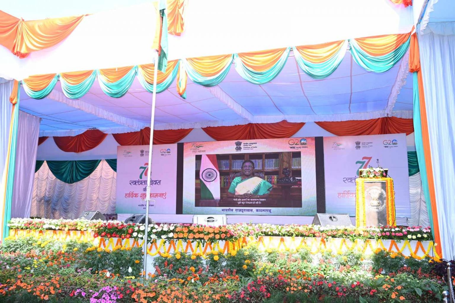 तत्पश्चात कार्यक्रममा भारतीय राष्ट्रपति द्रौपदी मुर्मूले राष्ट्रका नाममा गरेकाे सम्बोधन भिडियोमार्फत प्रस्तुत गरिएको थियो । राष्ट्रपति मुर्मूले आफ्नो सन्देशमा भारतको स्वतन्त्रता प्राप्तिका लागि स्वतन्त्रता सेनानीहरुले गरेका बलिदानको स्मरण गरे र देशले विभिन्न क्षेत्रमा हासिल गरेका उपलब्धिहरुबारे चर्चा गरे । राष्ट्रपतिले भारतको गाथाप्रति भारतीय डायस्पोरामा आफूले नयाँ विश्वास देखेको उल्लेख गरे ।