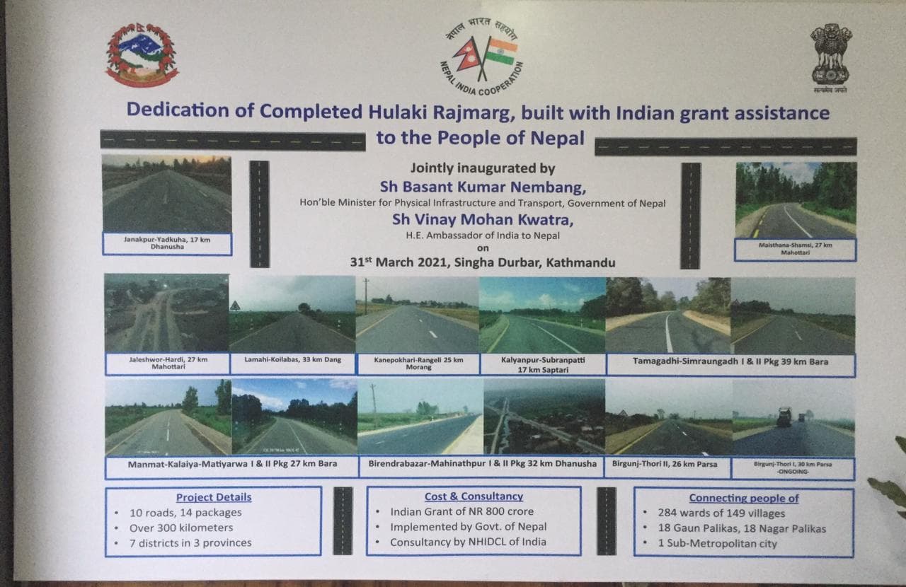 १४ वटा प्याकेज मध्ये निर्माण सम्पन्न भई सम्बन्धित क्षेत्रका जनताले प्रयोग गरिरहेका १३ वटा प्याकेज आज भारतीय राजदूत र भौतिक पूर्वाधार र यातायात मन्त्रीले संयुक्त रुपमा समर्पित गरे। यी हाल सालै निर्माण सम्पन्न भएका सडकले मानिसहरुको यात्रा तथा आवागमनलाई थम आरामदायी र सहज बनाएकोे छ ।