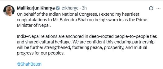 खड्गेले लेखेका छन्, ‘भारतीय राष्ट्रिय कांग्रेसको तर्फबाट, म श्री बालेन्द्र शाहलाई नेपालको प्रधानमन्त्रीको रूपमा शपथ ग्रहण गरेकोमा हार्दिक बधाई व्यक्त गर्दछु।’