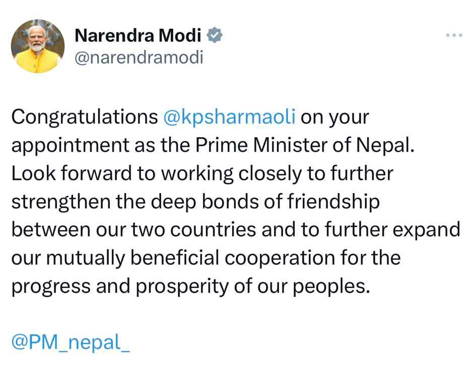 सोमबार सामाजिक सञ्जाल एक्समा भारतीय प्रधानमन्त्री मोदीले ओलीको कार्यकालमा दुई देशबीचको सम्बन्ध अझ प्रगाढ हुने विश्वास व्यक्त गरेका छन् ।