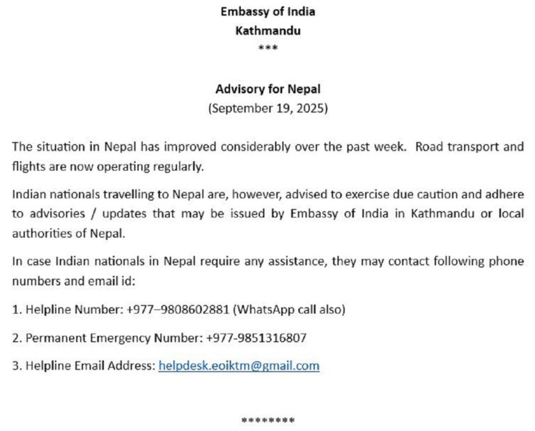 काठमाण्डु – जेन जी आन्दोलनपछि नेपालको पछिल्लो अवस्थाप्रति काठमाण्डुस्थित भारतीय दूतावासले आफ्ना नागरिकलाई सावधानी अपनाउन सुझाव दिँदै एडभाइजरी जारी गरेको छ ।