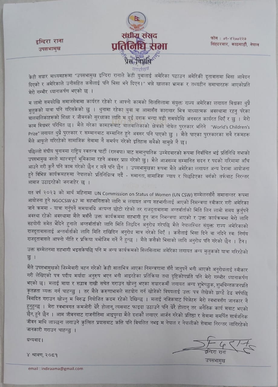 उपसभामुख रानाले आज विज्ञप्ति जारी गर्दै आफू राष्ट्रसंघको संयन्त्र ‘कमिसन अन द स्टाटस अफ वुमेन’ को ६७ औं सत्रमा भाग लिन जाँदा आफूलाई पनि साथी हुने देखेर भिसाको अन्तर्वार्ताको मिति अघि सारिदिन पत्र लेखिदिन आग्रह गरेकाले पत्र लेखिदिएको स्वीकारेकी हुन् । उनले त्यो महिलासम्बन्धी कार्यक्रममा महिला अधिकारको अभियानसँग कुनै साइनो नभएका ४ पुरुष र १ महिलालाई सँगै लग्न अमेरिकी दूतावासमा पत्राचार गरेकी थिइन् ।