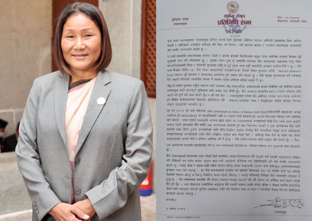 काठमाण्डु – उपसभामुख इन्दिरा रानाले आफूले पाँच जनालाई भिसाको मिति अघि सारिदिन नेपालस्थित संयुक्त राज्य अमेरिकाको दूतावासलाई आग्रह गरेको स्वीकारेकी छन् ।