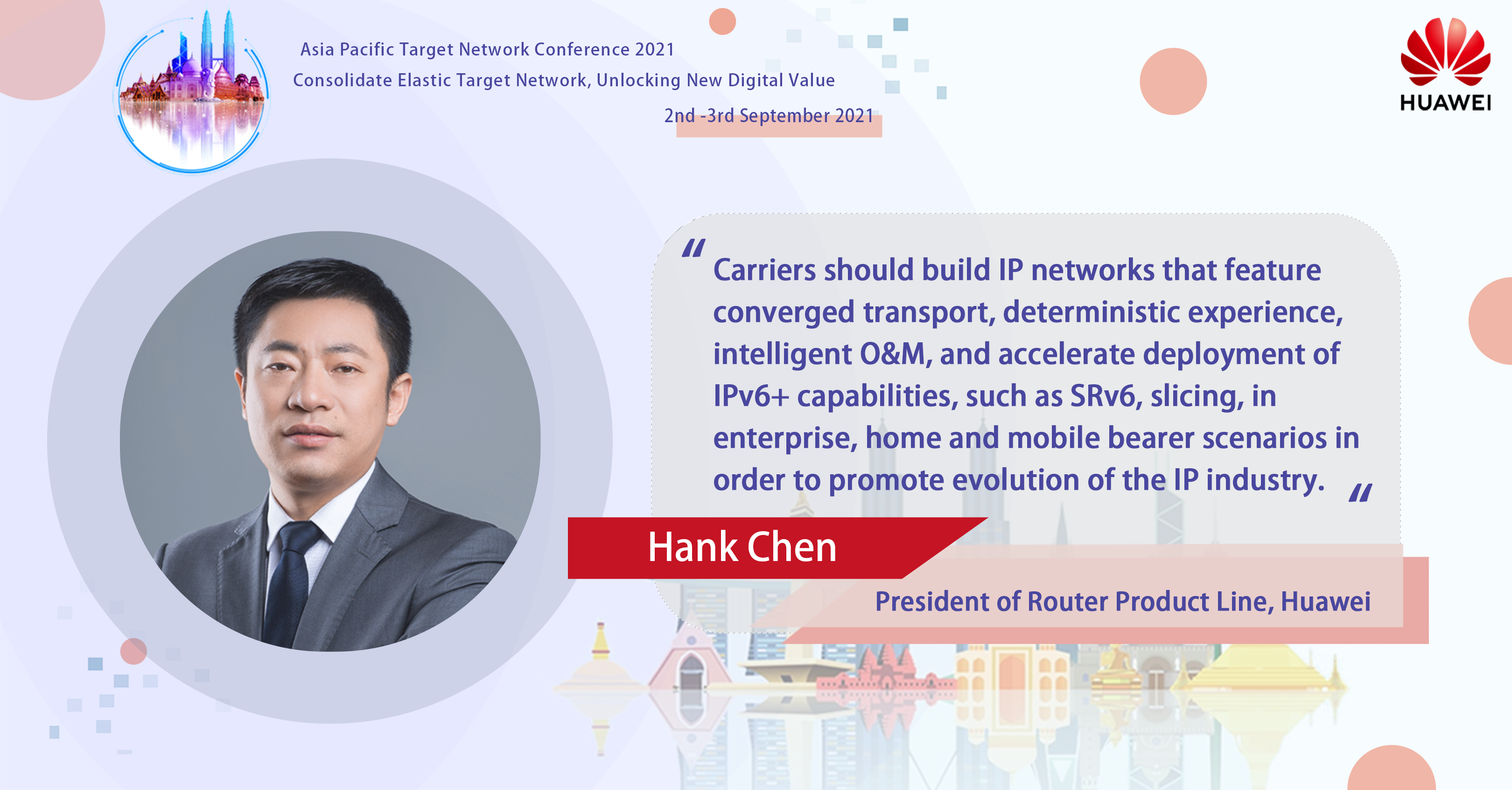 थाईल्याण्ड – ह्वावेका राउटर प्रोडक्टलाइनका अध्यक्ष ह्यांक चेनले डिजिटल रूपान्तरणको लागि आईपीभी-६ प्लस मा आधारित इन्टेलिजेन्ट क्लाउड नेटवर्क निर्माण गर्नुपर्ने बताएका छन् ।
