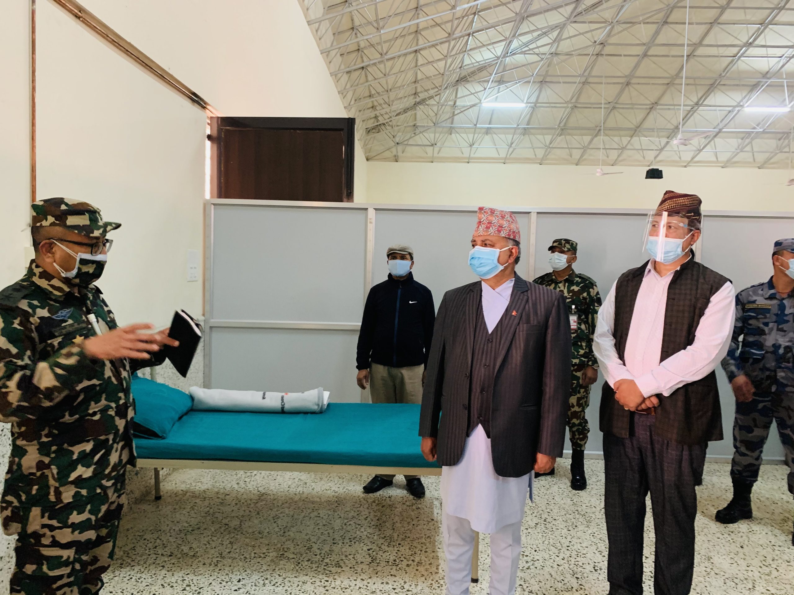 उपप्रधानमन्त्री पोखरेललाई नेपाली सेनाका क्लिनिक रजिष्टार महासेनानी डा. सुमनराज डंगोलले आइसोलेशन केन्द्रको बारेमा जानकारी गराएका थिए ।
