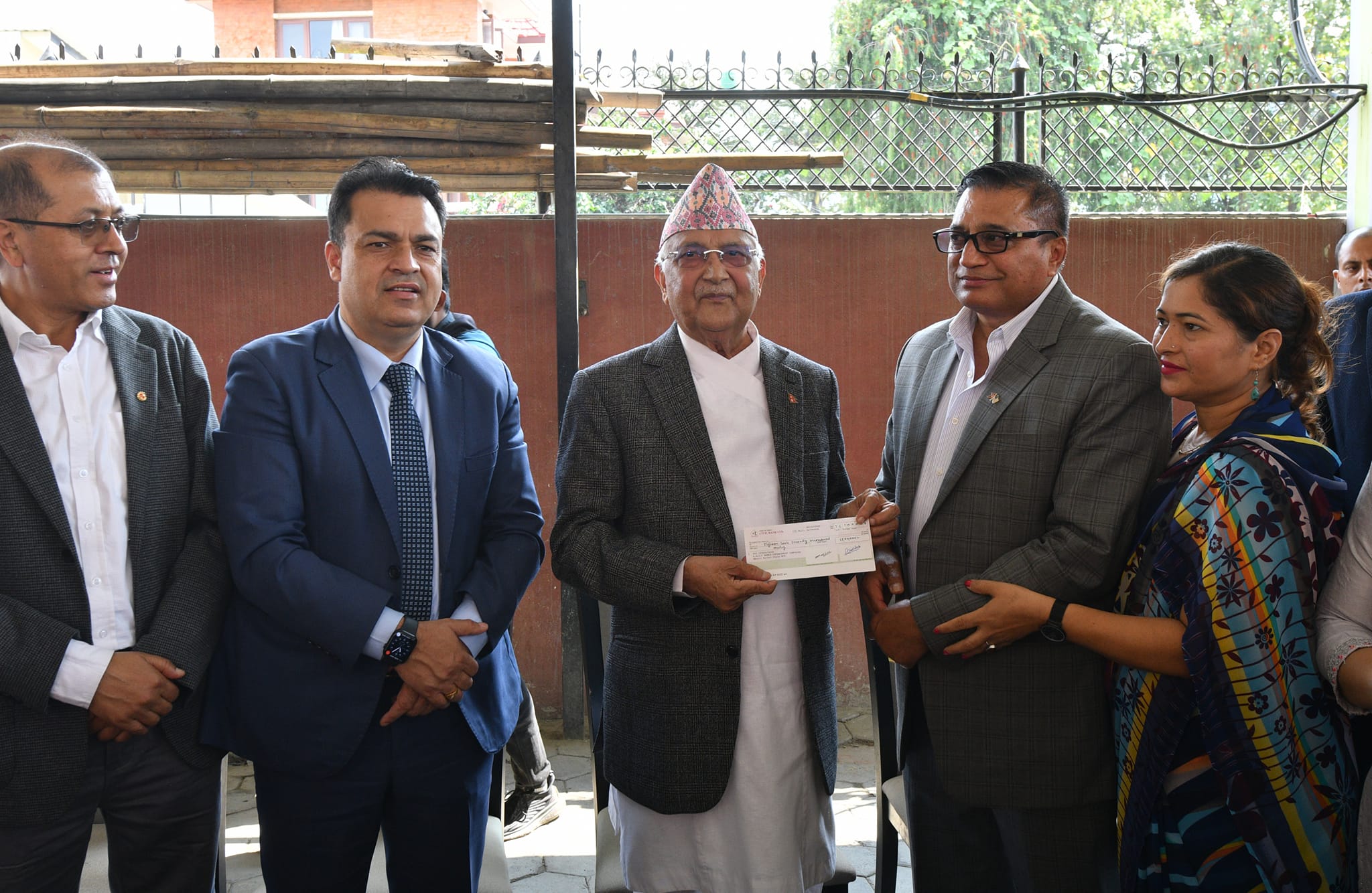 ओली निवास बालकोटमा आयोजित कार्यक्रममा अध्यक्ष थापाले एमाले अध्यक्ष ओलीलाई १० हजार अमेरिकी डलर बराबरको चेक हस्तान्तरण गरेका हुन् ।