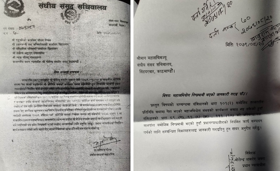 सम्माननीय प्रधान न्यायाधीश श्री चोलेन्द्र शमशेर जवराले मिति २०७१÷०८÷२० मा तत्कालिन प्रतिनिधि सभामा पेश भएको महाभियोग सो प्रतिनिधि सभाको कार्यकाल समाप्त भईसकेको हुदा निष्प्रभावी भएकोले प्रधान न्यायाधीशको नियमित कार्य सम्पादन गर्नको लागि सम्बन्धित निकायहरुलाई जानकारी गराइदिनुहुन भन्ने व्यहोसको निवेदन यस सचिवालयमा दिनु भएको विषय अनुरोध गर्दछ। उपरोक्त निवेदनको सम्बन्धमा मिति २०७८ फागुन १. राते नेपालको संविधानको धारा १०१÷२) बमोजिम वहां विरुद्ध तत्कालिन प्रतिनिधि सभामा दर्ता भएको महाभियोग प्रस्ताव र तत्पश्चात संघीय संसदको महासचिवबाट संविधानको धारा १०१ (६) बमोजिम कार्य सम्पादन गर्न नपाउने भन्ने व्यहोराको पत्र माथि उल्लेखित निकायमा जानकारी गराईएको थियो । सो महाभियोगको प्रस्ताव तत्कालिन प्रतिनिधि सभामा पेश, प्रारम्भिक छलफल र महाभियोग सिफारिस समितिबाट प्रतिवेदन बुझाईएको तर तत्पश्चातको प्रक्रिया अगाडि नबढेको अवस्थामा २०७९ मंसिरमा नयाँ प्रतिनिधि सभाको निर्वाचन सम्पन्न भई सकेकोले २०७८ फागुन १ मा तत्कालिन समयमा महासचिवबाट सम्माननीय प्रधान न्यायाधीश श्री चोलेन्द्र शमशेर जवराले कार्य सम्पादन गर्न नपाउने भन्ने व्यहोराको पत्र समेत निष्प्रभावी भएको व्यहोरा जानकारीको लागि अनुरोध गर्दछु। प्रधान न्यायाधीशको नियमित कार्य सम्पादन गर्नको लागि वहाले दिनु भएको निवेदनको छायाप्रति यसै साथ संलग्न रहेको छ ।