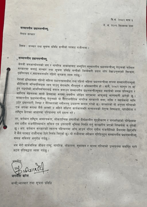 सञ्चारमन्त्री जगदीश खरेलद्वारा राजीनामा