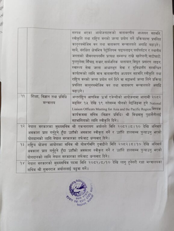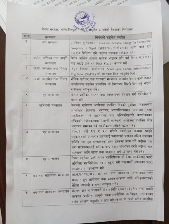 भौतिक पूर्वाधार तथा यातायात मन्त्रालयअन्तर्गत नेपाल पानीजहाज कार्यालयमा कार्यरत सहसचिव प्रेमकुमार सिंहले पेश गरेका राजीनामा स्वीकृत गर्ने र नेपाल प्रहरीको संगठन तथा व्यवस्थापन सर्वेक्षण गर्न पूर्वस्वीकृति प्रदान गर्ने निर्णय पनि भएको उनले जानकारी दिए ।