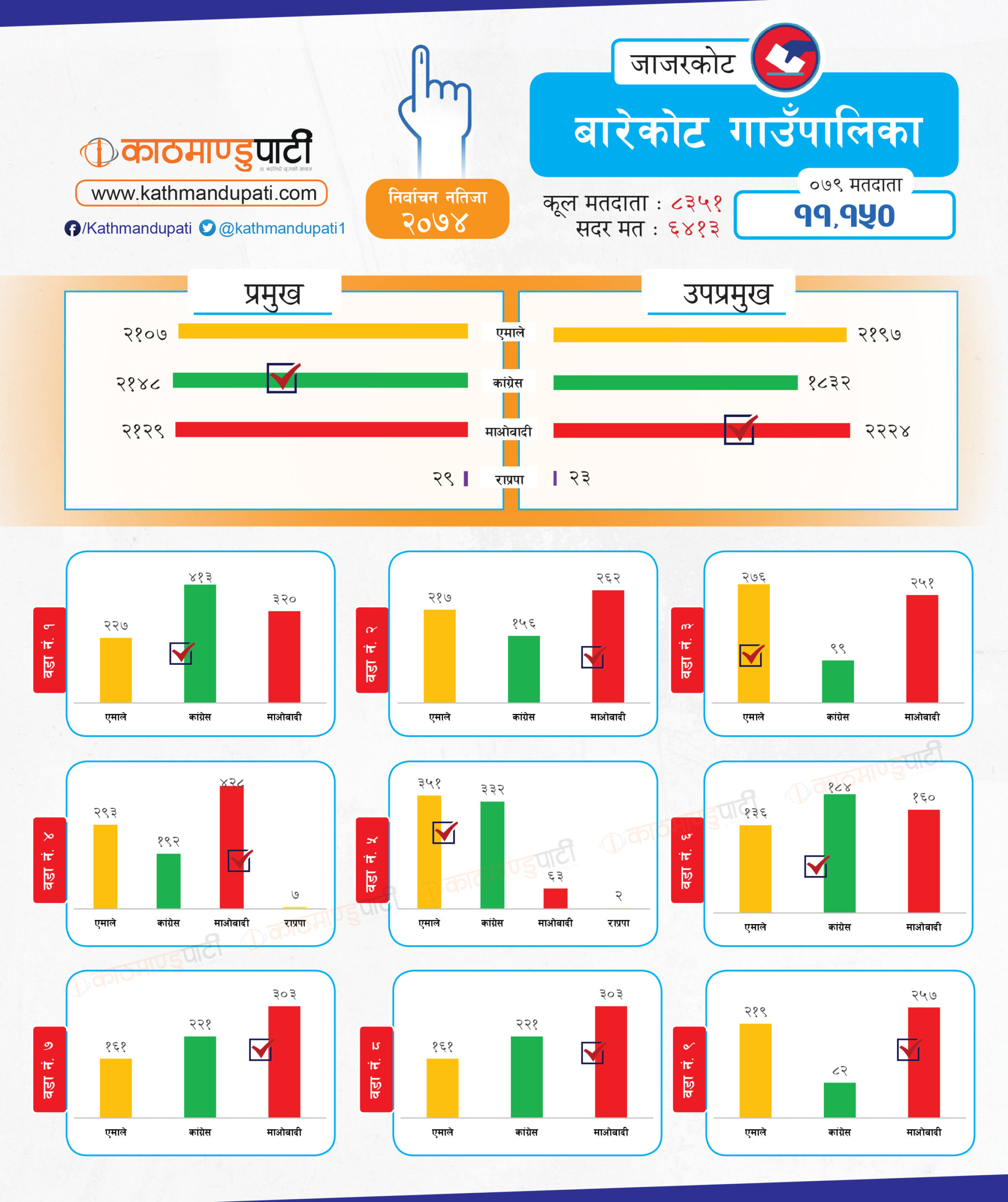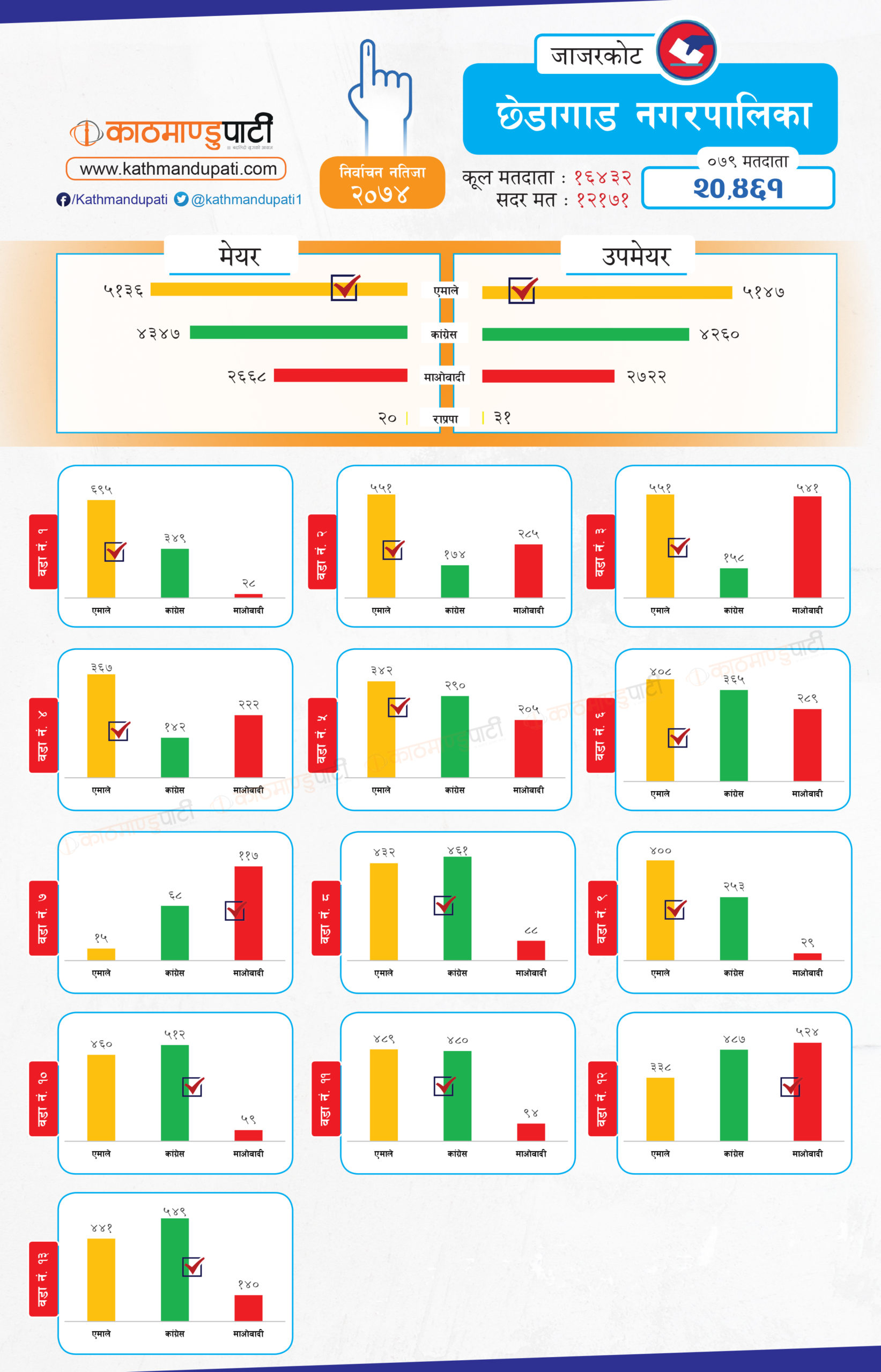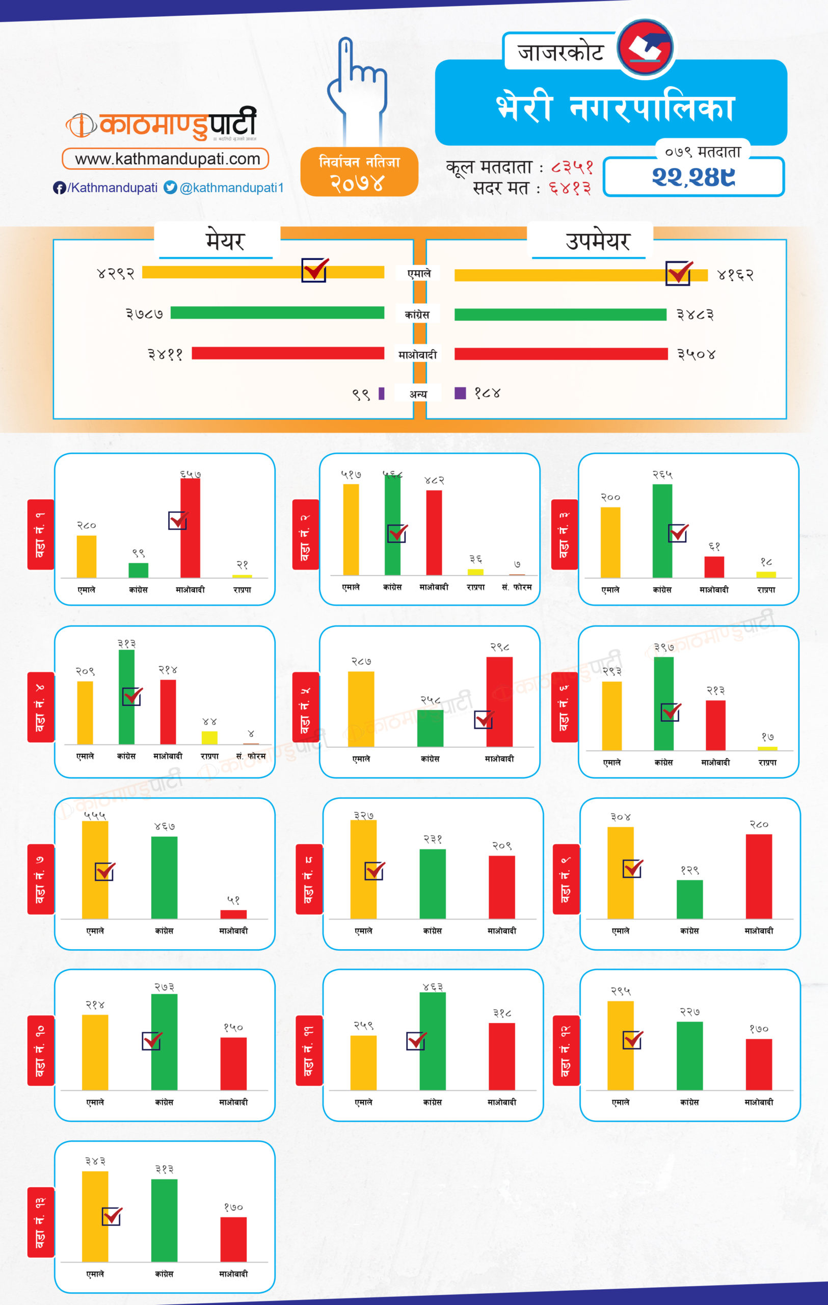 गठबन्धनको संयन्त्रले छेडागाड नगरको मेयर कांग्रेस र उपमेयर माओवादी, नलगाडको मेयरमा माओवादी र उपमेयरमा कांग्रेस, भेरी नगरपालिकाको मेयरमा एकीकृत समाजवादी र उपमेयर कांग्रेस, शिवालयमा माओवादीको अध्यक्ष र कांग्रेसको उपाध्यक्ष, बारेकोटमा अध्यक्ष कांग्रेस र उपाध्यक्ष माओवादीले लिने गरी सहमति भएको छ । तर, यो सहमतिअनुसार उम्मेदवारी दर्ता भने भएको छैन । त्यसैले तालमेल कार्यान्वयन हुनेमा शंका देखिएको छ ।