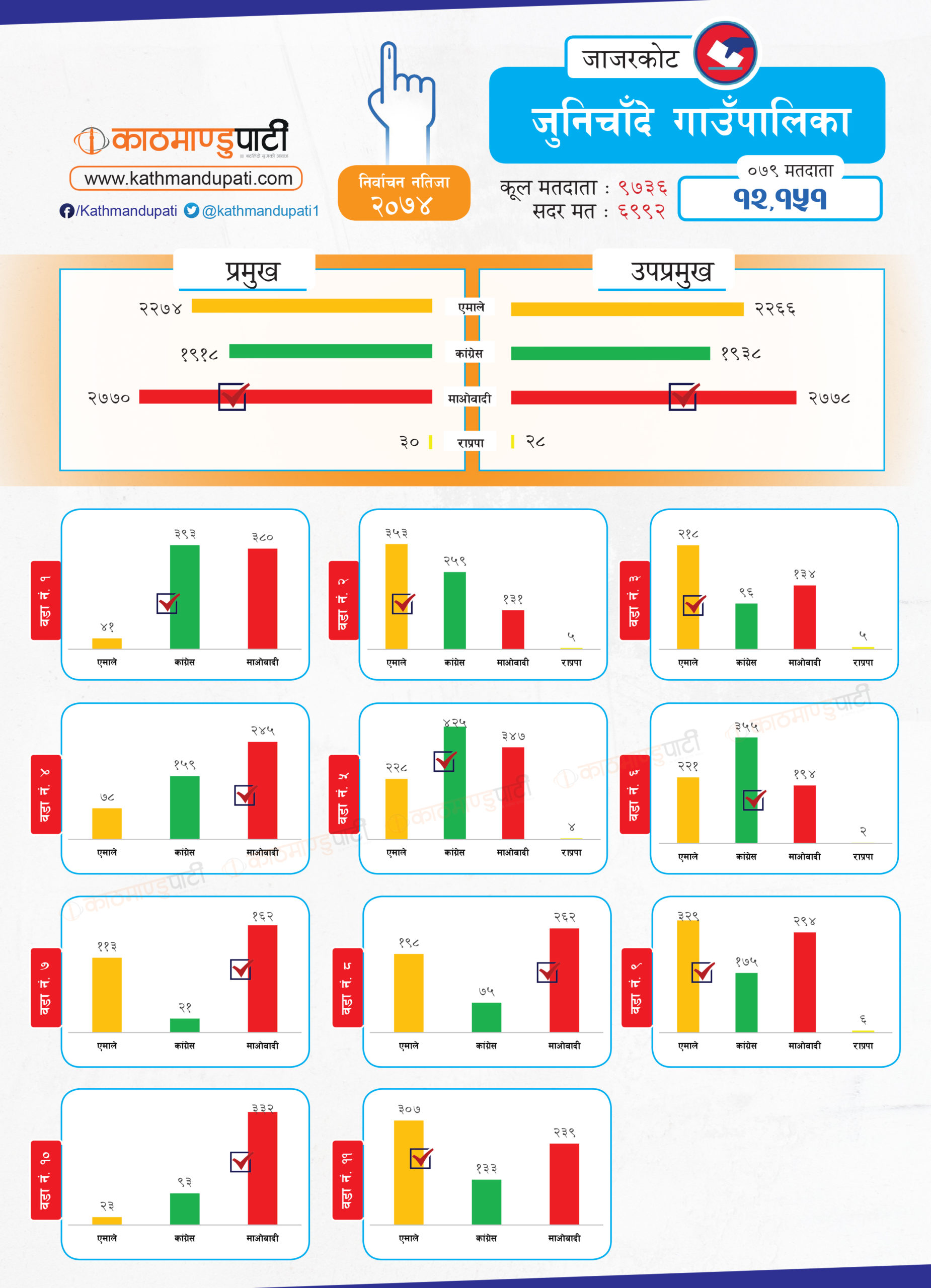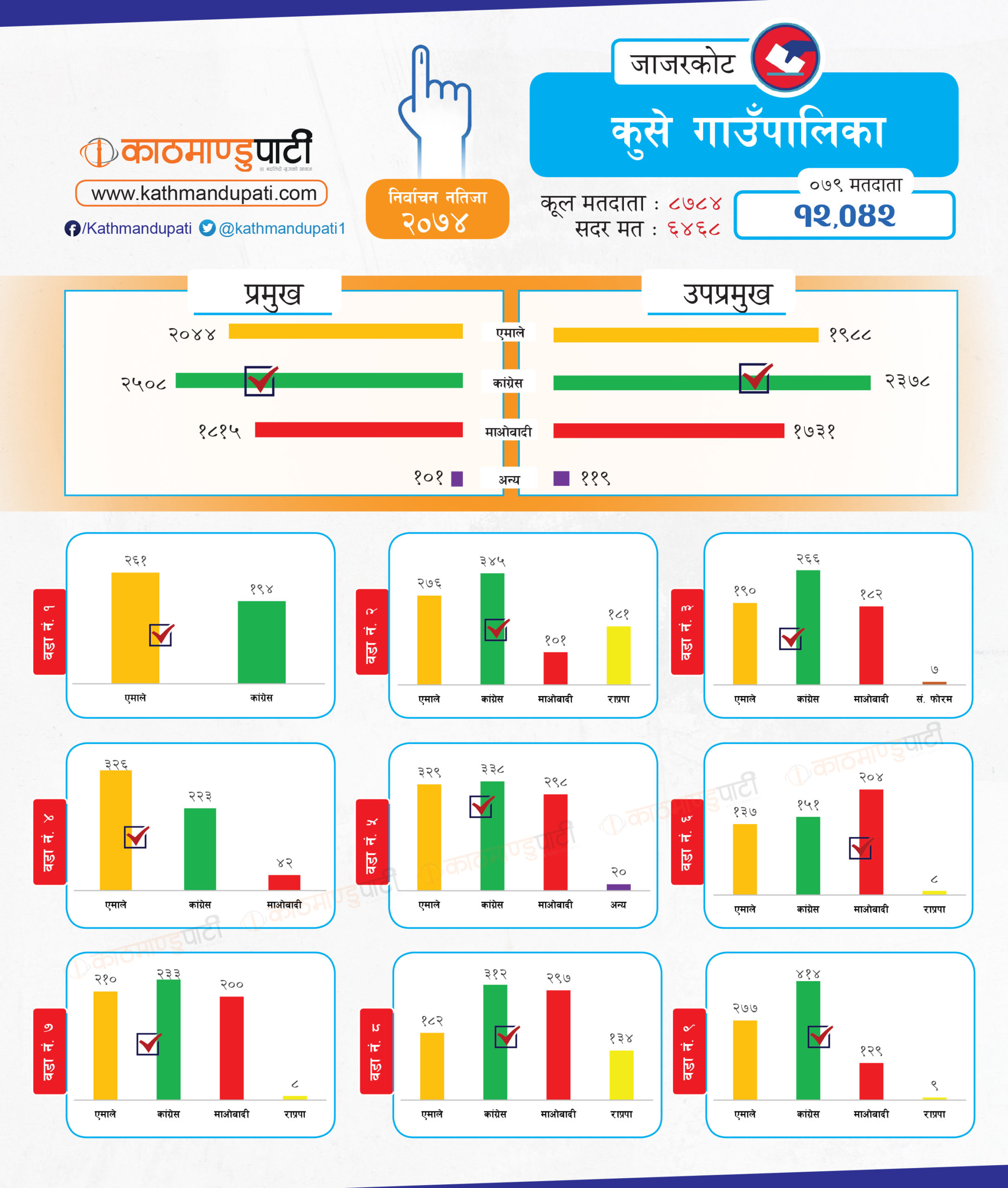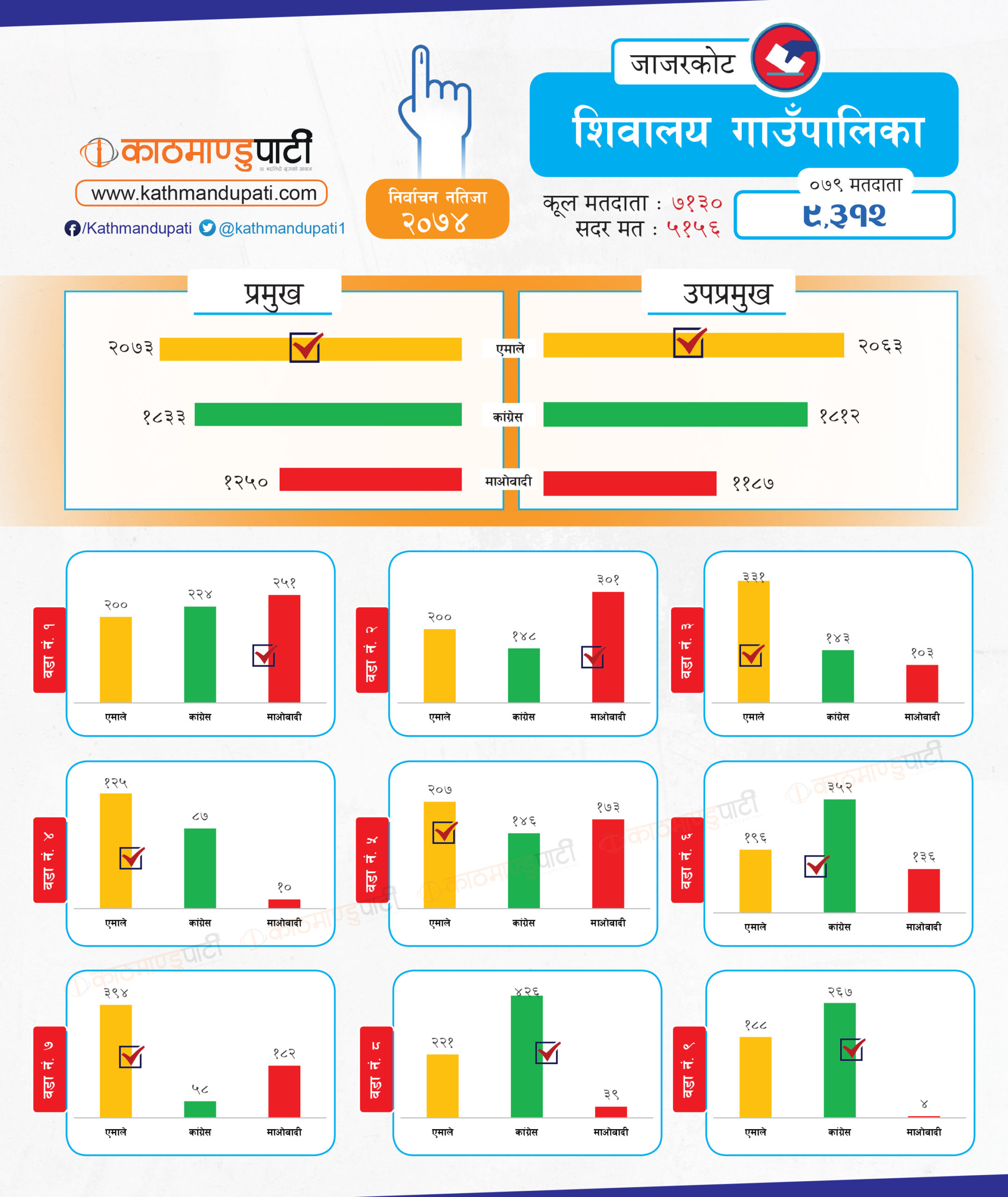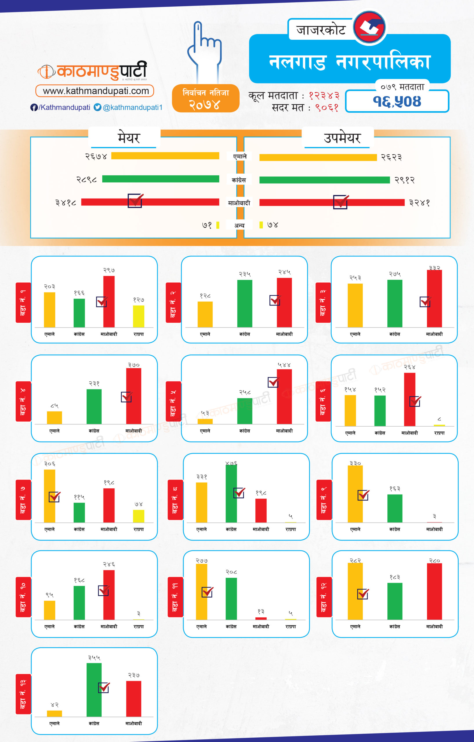 ०७४ सालको नतिजाका आधारमा एमाले ठूलो दल हो । उसले छेडागाड र भेरी नगरपालिकाको मेयर–उपमेयर तथा शिवालय गाउँपालिकाको अध्यक्ष–उपाध्यक्ष जितेको थियो । माओवादीले नलगाड नगरपालिकाको मेयर–उपमेयर तथा जुनिचाँदे गाउँपालिकाको अध्यक्ष–उपाध्यक्ष जित्यो ।उसले बारेकोट गाउँपालिकाको उपाध्यक्ष पनि जितेको थियो । कांग्रेसले कुसे गाउँपालिकामा अध्यक्ष–उपाध्यक्ष तथा बारेकोटमा अध्यक्ष जितेर आफूलाई प्रतिस्पर्धी दलका रूपमा उभ्याएको थियो ।