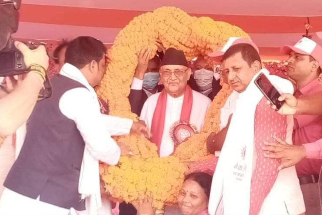 सोमबार विभिन्न राजनीतिक दलका नेता तथा कार्यकर्तालाई पार्टी प्रवेश गराउन जनकपुरधाम पुगेका अध्यक्ष ओलीलाई २०५ किलोको माला तथा गमछा लगाएर सम्मान गरिएको हो ।