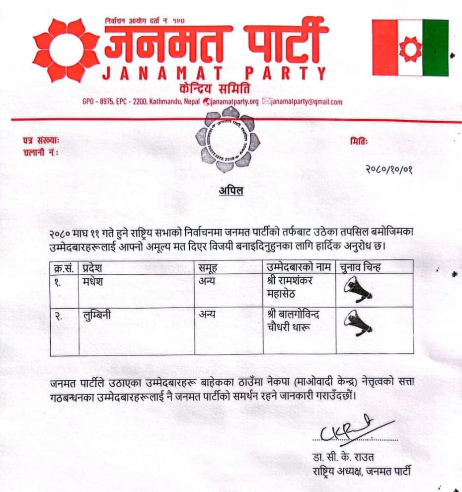 काठमाण्डु – आसन्न राष्ट्रियसभा सदस्य निर्वाचनमा जनमत पार्टीले मधेश र लुम्बिनी प्रदेशमा छुट्टै उम्मेदवार कायमै राखेको छ ।