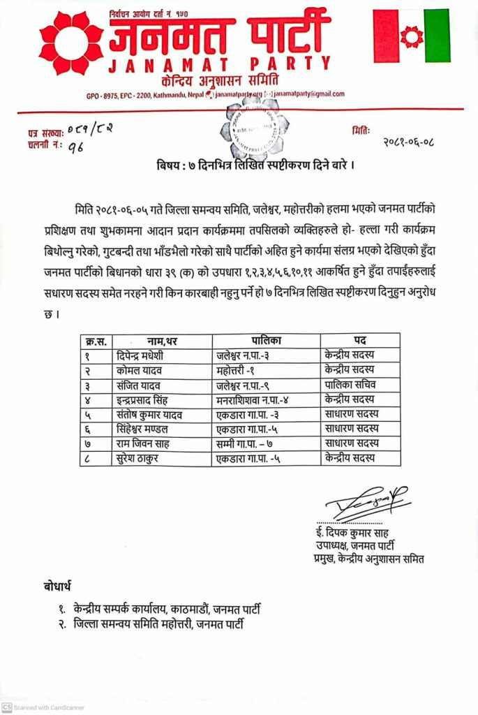 अनुशासन समितिका प्रमुख तथा पार्टी उपाध्यक्ष ई. दिपककुमार साहले केन्द्रीय सदस्य दिपेन्द्र मधेशी, कोमल यादव, इन्द्रप्रसाद सिंह, सुरेश ठाकुरलाई स्पष्टीकरण सोधिएको छ ।