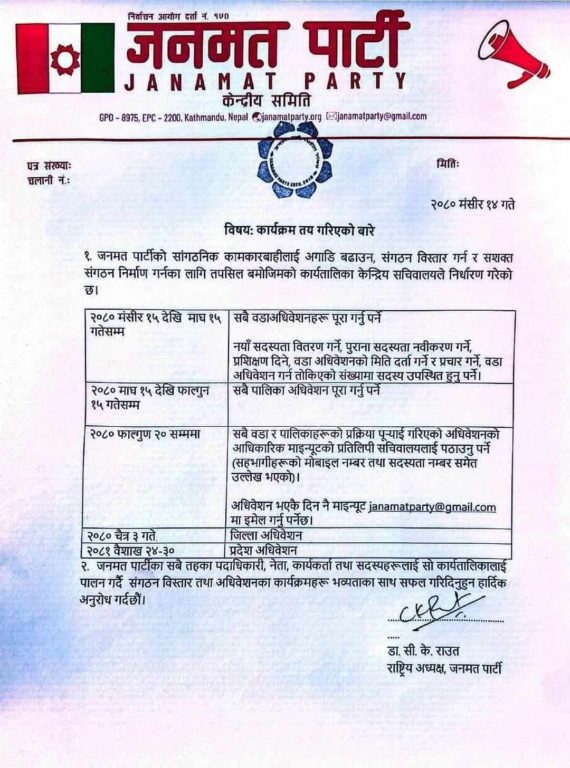 जनमतले चैत्र ३ गते जिल्ला अधिवेशनको मिति तय गरेको छ । २०८१ वैशाख २४–३० गतेभित्र प्रदेश अधिवेशन गरिसक्न जनमतले निर्देशन दिएको छ ।
