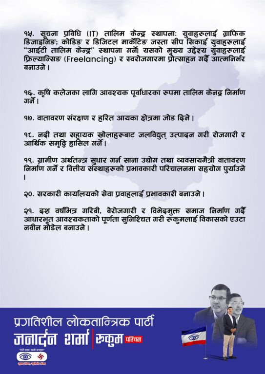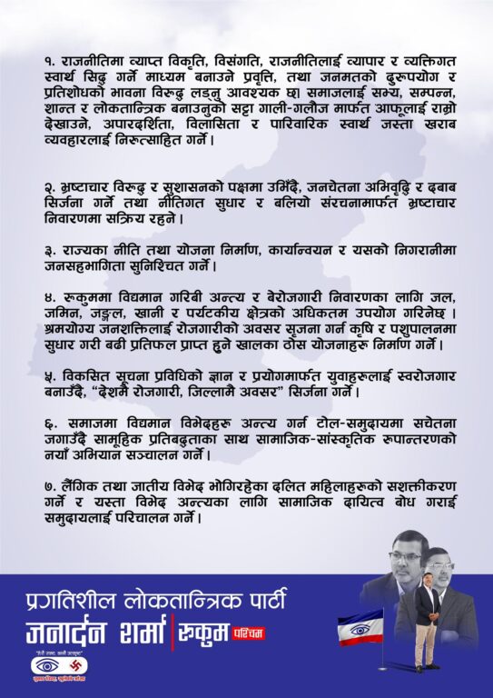 काठमाण्डु – प्रगतिशील लोकतान्त्रिक पार्टीका संरक्षक तथा रुकुम–पश्चिमका उम्मेदवार जनार्दन शर्माले आफ्नो चुनावी प्रतिबद्धता सार्वजनिक गरेका छन् ।