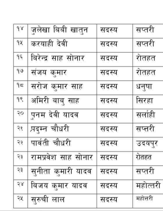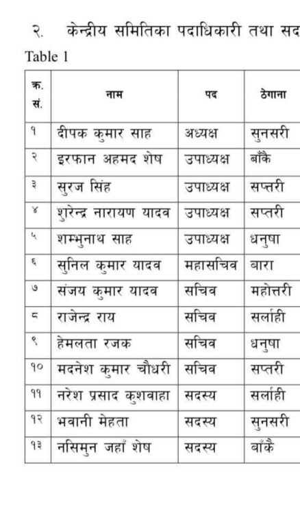 दीपक साहको अध्यक्षता २३ सदस्य कार्यसमिति गठन भएको छ । त्यसमा सुरज सिंह र सुरेन्द्रनारायण यादव उपाध्यक्ष रहेका छन् । अरू बाँकी सबै जना सदस्य रहेका छन् ।