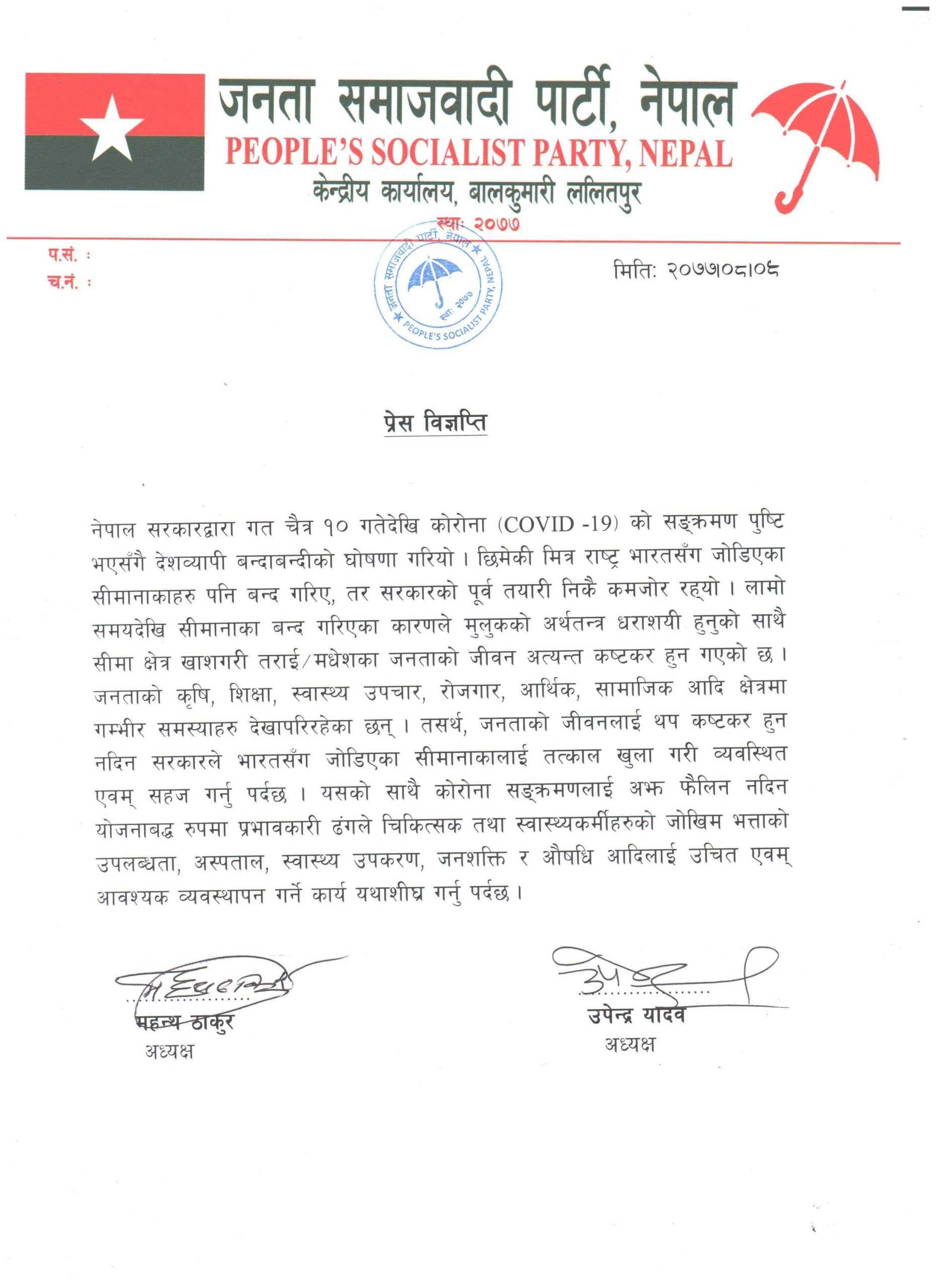 ‘जनताको शिक्षा, कृषि, स्वास्थ्य उपचार, रोजगार, आर्थिक सामाजिक आदि क्षेत्रमा गम्भीर समस्याहरु देखा परिहेका छन् । तसर्थ जनताको जीवनलाई थप कष्टकर हुन नदिन सरकराले भारतसँग जोडिएका सीमानाकालाई तत्काल खुला गरी व्यवस्थित एवं सहज गर्नुपर्दछ’, विज्ञप्तिमा भनिएको छ ।