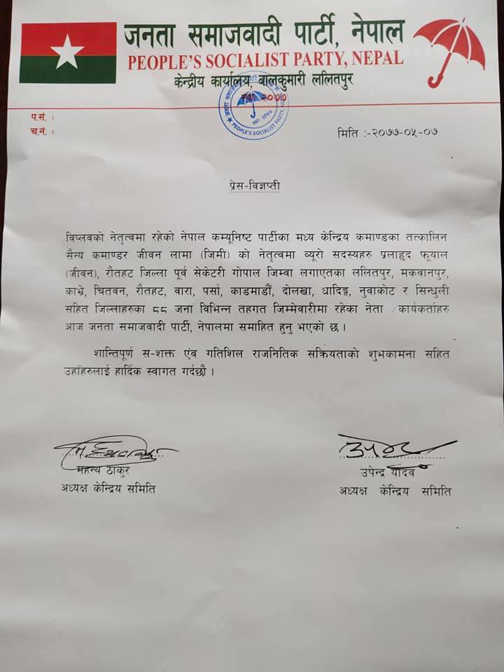 कमाण्डर लामा नेतृत्वमा ब्यूरो सदस्यहरु प्रह्लाद फुयाल, रौतहट जिल्ला पूर्व सेक्रेटरी गोपाल जिम्बालगायत विभिन्न तह र जिल्लाका ८८ जना नेताहरु जसपामा समाहित भएको पार्टीका अध्यक्षद्वय महन्थ ठाकुर र उपेन्द्र यादवद्वारा जारी विज्ञप्तिमा जनाइएको छ ।
