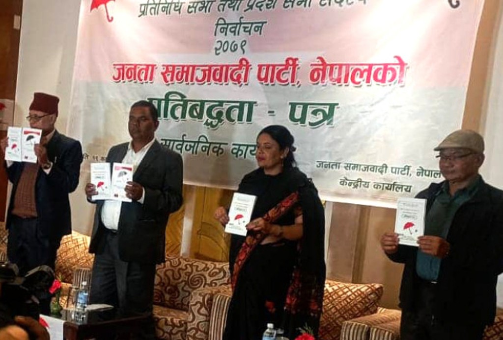 काठमाण्डु – जनता समाजवादी पार्टी (जसपा) ले घोषणापत्र सार्वजनिक गरेको छ । जसपाले शनिबार आगामी मंसिर ४ गते हुने प्रतिनिधिसभा र प्रदेशसभाको निर्वाचनलाई लक्षित गर्दै घोषणापत्र सार्वजनिक गरेको हो ।