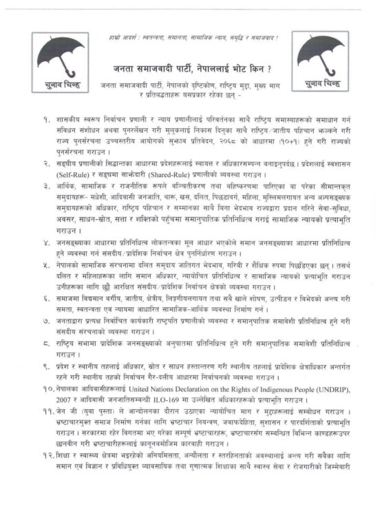 ‎घोषणापत्रमा जनसंख्याका आधारमा निर्वाचन क्षेत्र पुनर्निर्धारण, दलित र महिलाका लागि छुट्टै आरक्षित निर्वाचन क्षेत्र, प्रत्यक्ष निर्वाचित कार्यकारी राष्ट्रपति प्रणाली, राष्ट्रिय सभामा जनसंख्याको अनुपातमा प्रतिनिधित्व, तथा स्थानीय तहको निर्वाचन गैरदलीय आधारमा गरिनुपर्ने प्रस्ताव समेटिएको छ ।