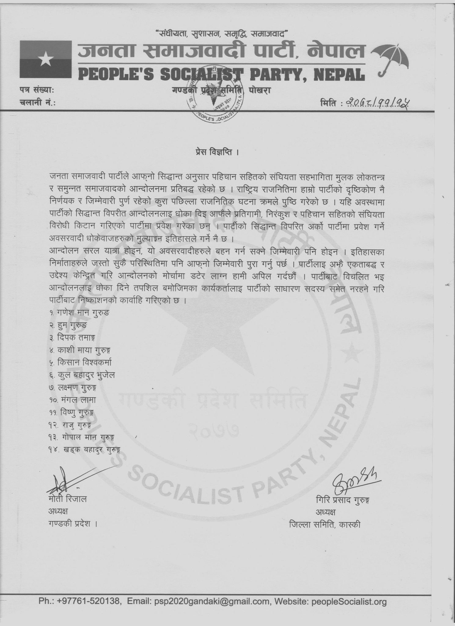 काठमाण्डु – जनता समाजवादी पार्टी (जसपा)ले १४ जना नेता तथा कार्यकर्तालाई कारबाही गरेको छ । पार्टीको गण्डकी प्रदेश कमिटीले केही दिन पहिले जसपा त्यागेका १४ जना नेता तथा कार्यकर्तालाई साधारण सदस्यसमेत नरहने गरी पार्टीबाट निष्कासन गरेको हो ।