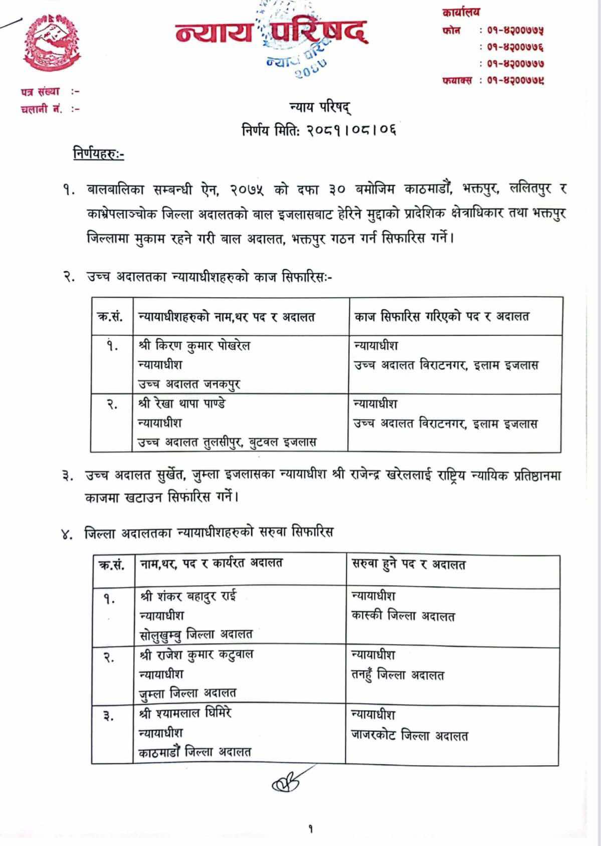 विज्ञप्ति अनुसार उच्च अदालत जनकपुर न्यायधीश किरणकुमार पोखरेललाई उच्च अदालत विराटनगरको इलाम इजलासमा र उच्च अदालत तुल्सीपुरको बुटवल इजलाशमा कार्यरत न्यायाधीश रेखा थापा पाण्डेको उच्च अदालत विराटनगरको इलाम इजलाशमा काज सरुवा सिफारिस भएको छ ।