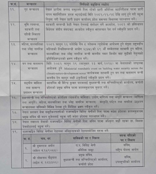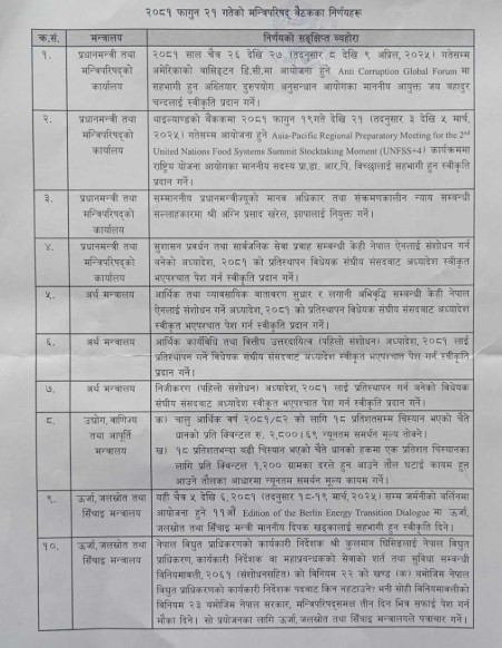 यस्तै बैठकले थाइल्यान्डको बैंककमा २०८१ फागुन १९ देखि २१ ९तदनुसार ३ देखि ५ मार्च, २०२५ ० सम्म आयोजना हुने एसिया प्यासिफिक रिजनल प्रिपेरेटोरी मिटिङ फर द सेकेन्ड युनाइटेड नेसन्स फुड सिस्टम समिट स्टकटेकिङ मुमेन्ट कार्यक्रममा राष्ट्रिय योजना आयोगका सदस्य प्राडा आरपी बिच्छालाई सहभागी हुन स्वीकृति प्रदान गर्ने निर्णय गरेको छ ।
