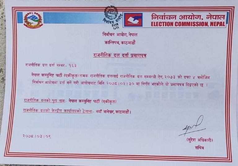 काठमाण्डु – नेकपा एमालेको माधव नेपाल समूहका युवा नेता जीवन राइले निर्वाचन आयोगबाट नयाँ दल दर्ताको प्रमाणपत्र पाएका छन् । निर्वाचन आयोगले कलम चिन्हसहितको दल दर्ताको प्रमाणपत्र राईलाई आज प्रदान गरेको हो ।
