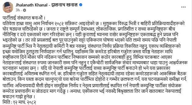 सामाजिक सञ्जाल फेसबुकमा आफ्नो धारणा व्यक्त गर्दै खनालले पार्टीका नेता हरिबोल गजुरेललाई गरिएको कारबाहीप्रति संकेत गर्दै उक्त निर्णय फिर्ता नभए पार्टी एकीकरण भई नसक्दै विशृङ्खलता तिर जाने खतराबाट नेकपालाई बचाउन गाह्रो हुने उल्लेख गरेका छन् ।
