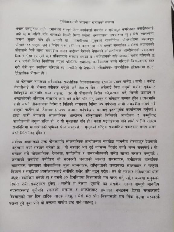सर्वोच्च अदालतको फैसलाले संविधान र लोकतन्त्रको रक्षा गरेको भन्दै उनले आफ्नो मत देउवा सरकारकै पक्षमा हुने बताएका छन् । उनले भनेका छन्, ‘यो सरकार संविधानको धारा ७६ (५) बमोजिम बनेको र यसले ३० दिनभित्रमा विश्वासको मत प्राप्त गर्नुपर्छ । अन्यथा मुलुकको स्थिति फेरी संकटग्रस्त हुनेछ । त्यसैले म नेकपा (एमाले) का संसदीय दलका सम्पूर्ण माननीय सदस्यहरुलाई कुनै पनि प्रकारको अलमल र आक्रोशबाट प्रभावित नभइकन देउवा सरकारलाई विश्वासको मत दिन हार्दिक आग्रह गर्दछु । मेरो मत पनि विश्वासको मत लिँदा देउवा सरकारकै पक्षमा हुने कुरा पनि यो वक्तव्य मार्फत प्रष्ट पार्न चाहन्छु ।’