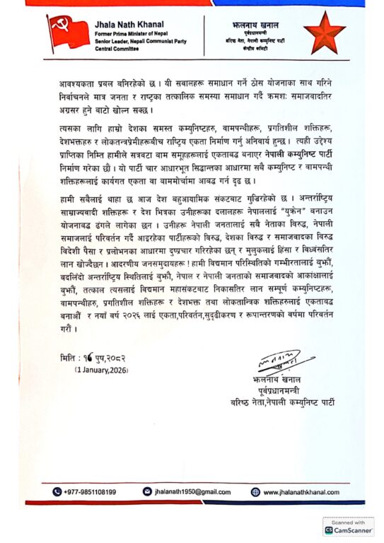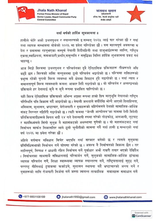 अंग्रेजी नयाँ वर्ष २०२६ को अवसरमा शुभकामना सन्देश जारी गर्दै उनले अन्तर्राष्ट्रिय साम्राज्यवादी शक्तिहरू र देशभित्रका उनीहरूका दलालहरूले नेपाललाई अस्थिरता, हिंसा र विध्वंसतर्फ धकेल्न खोजिरहेको आरोप लगाएका हुन्।