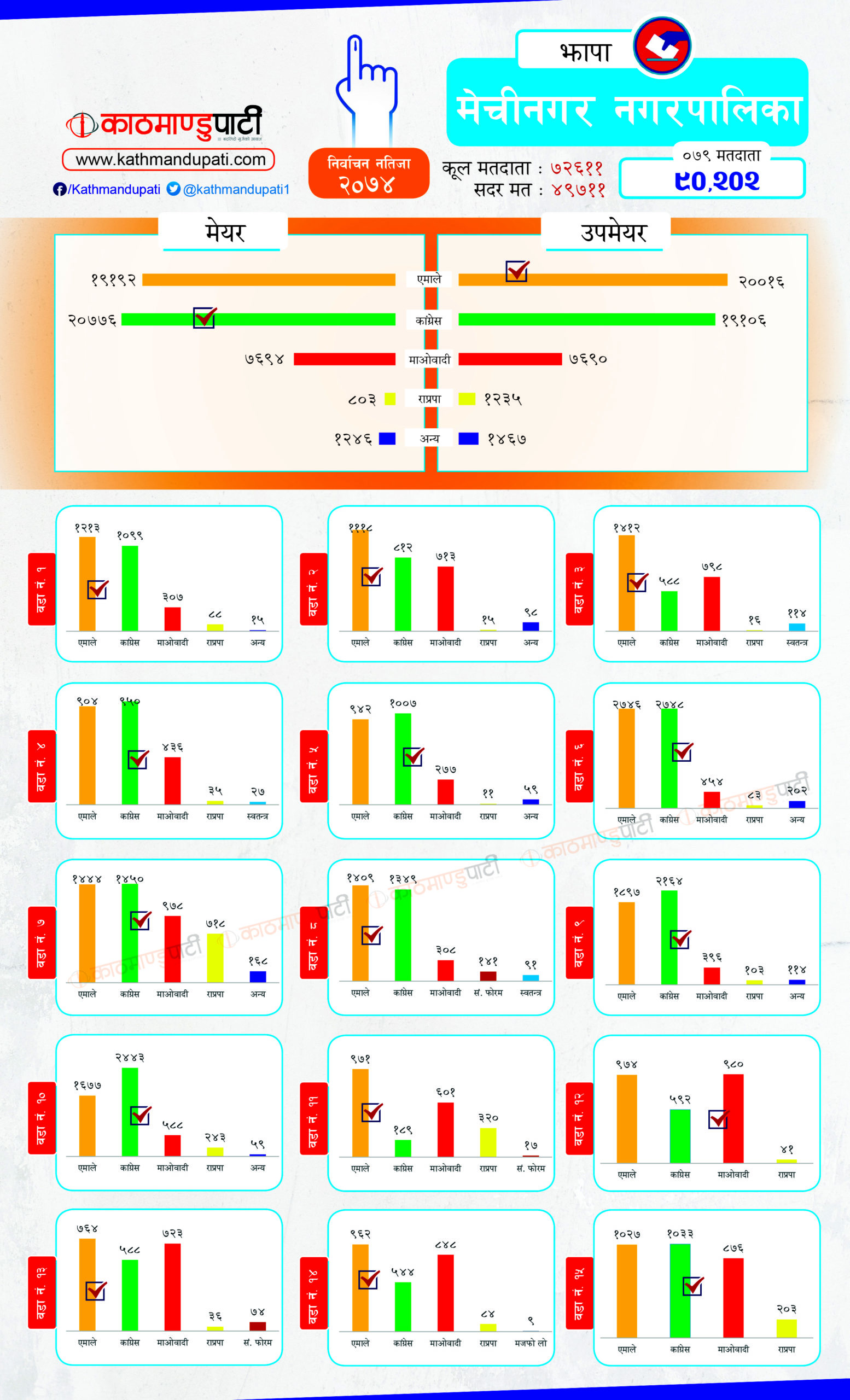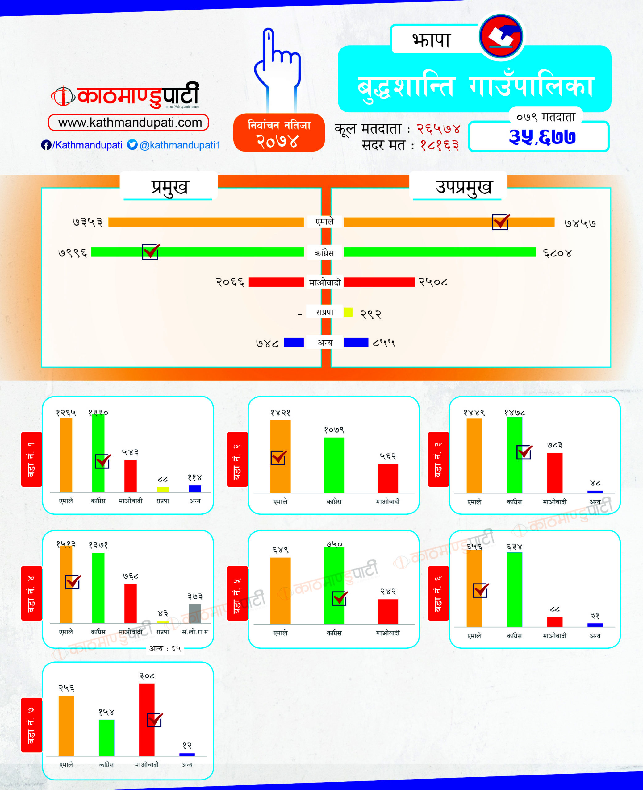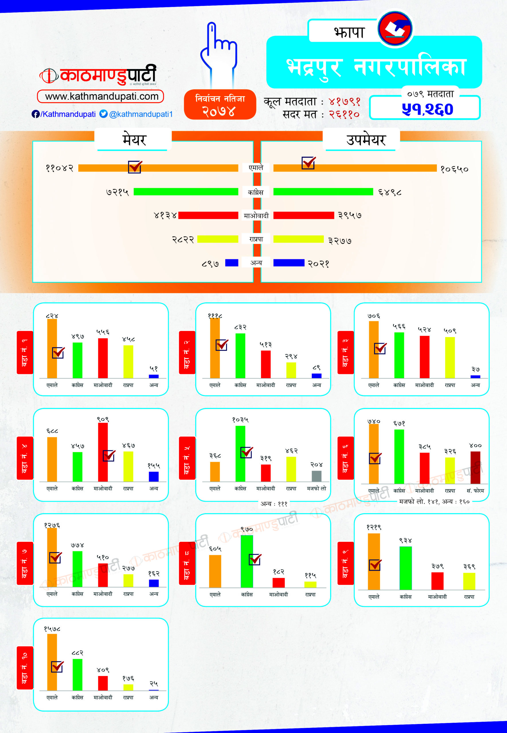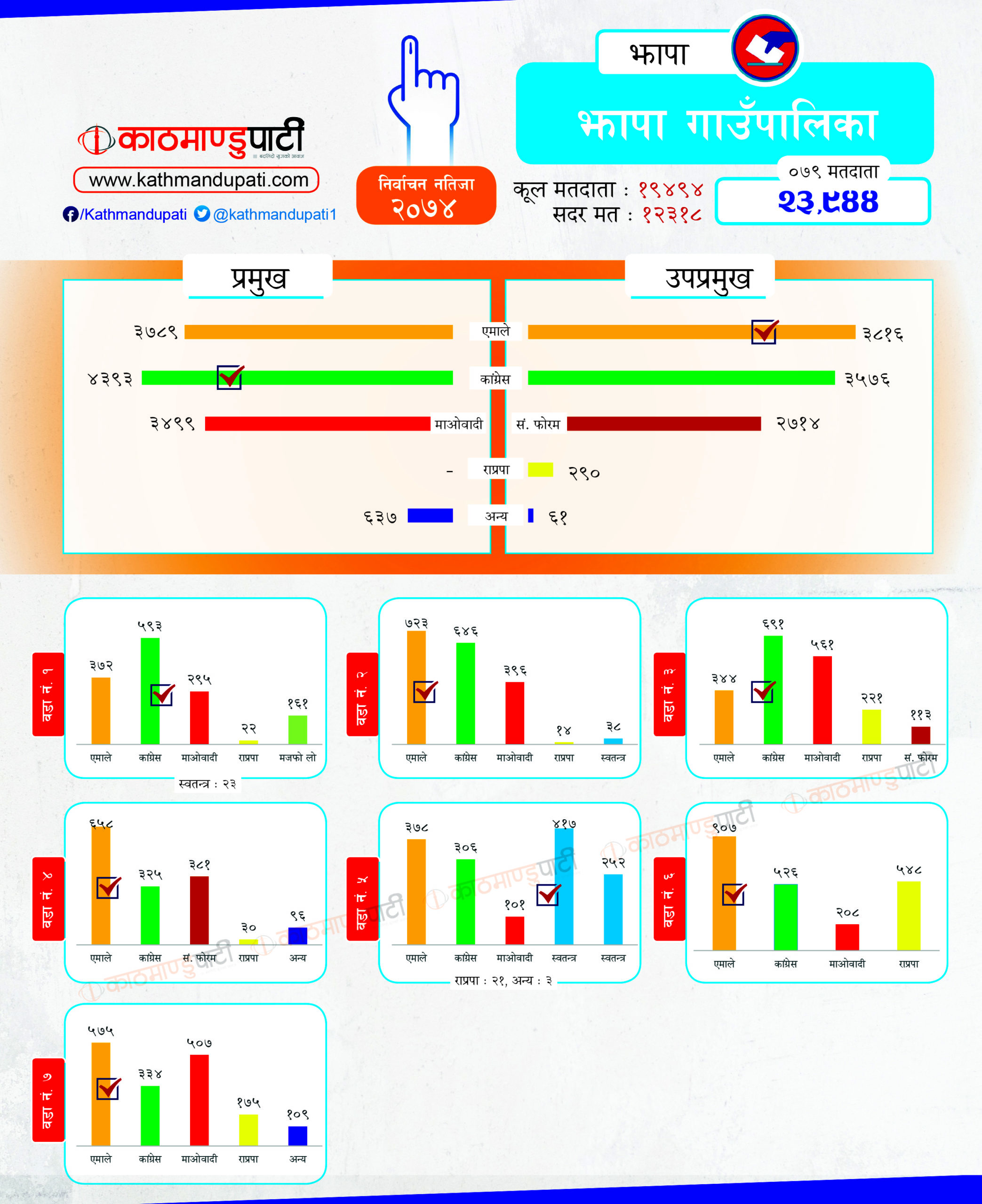 कांग्रेसले गौरादह नगरपालिका, झापा गाउँपालिका, बाह्रदशी गाउँपालिका, बुद्धशान्ति गाउँपालिका र मेचीनगर नगरपालिका जितेको थियो भने कचनकवल गाउँपालिका, गौरीगन्ज गाउँपालिका र हल्दीबारी गाउँपालिका राप्रपाले जितेको थियो । चौथो शक्ति माओवादीले कुनै पालिका जित्न सकेन ।