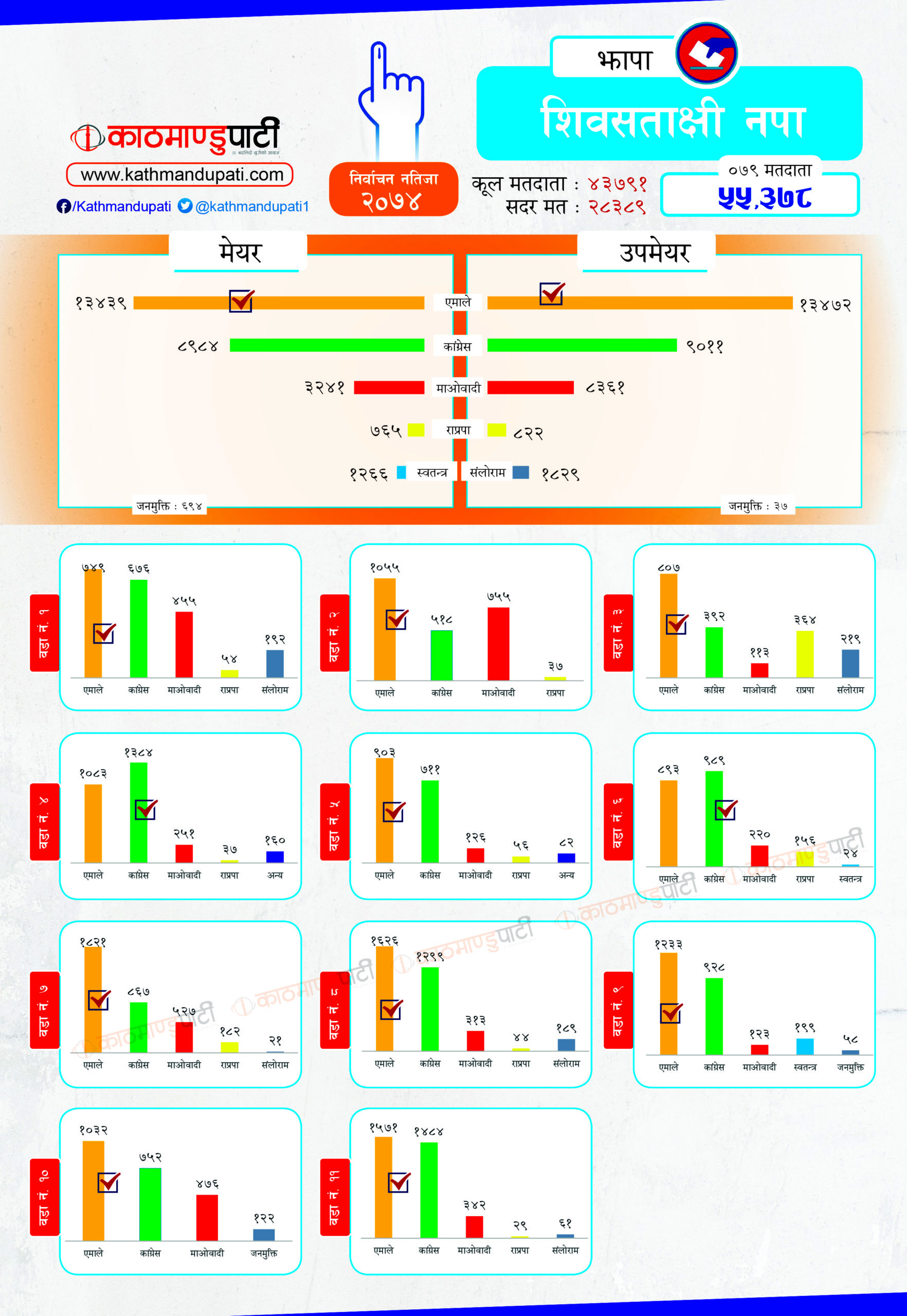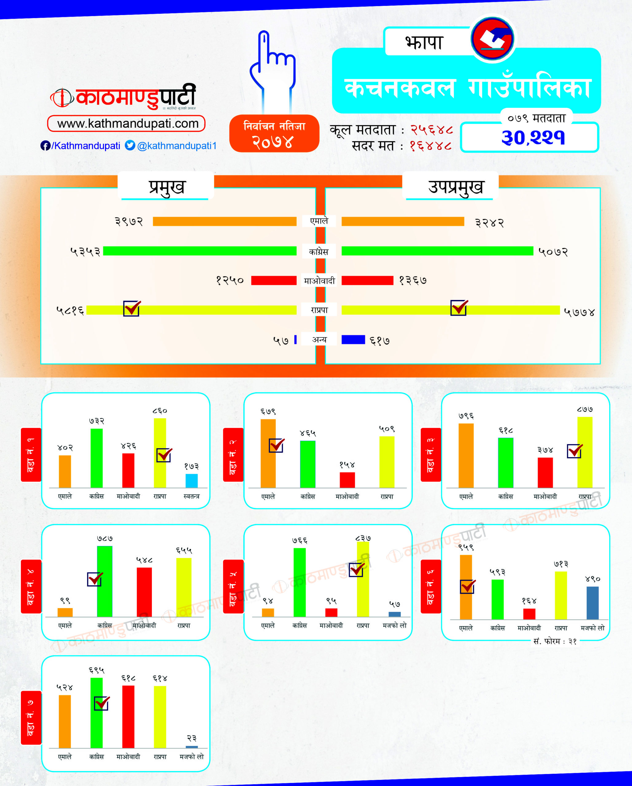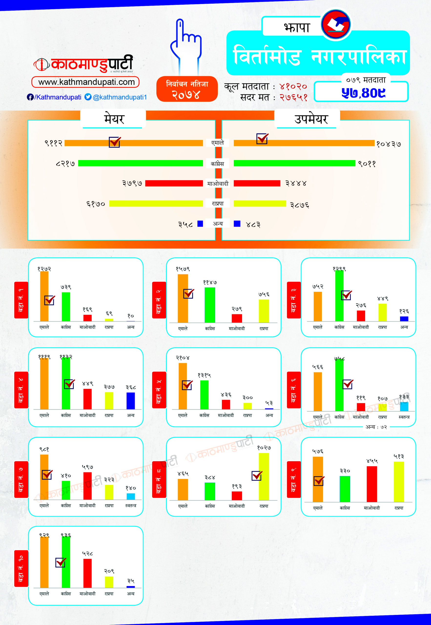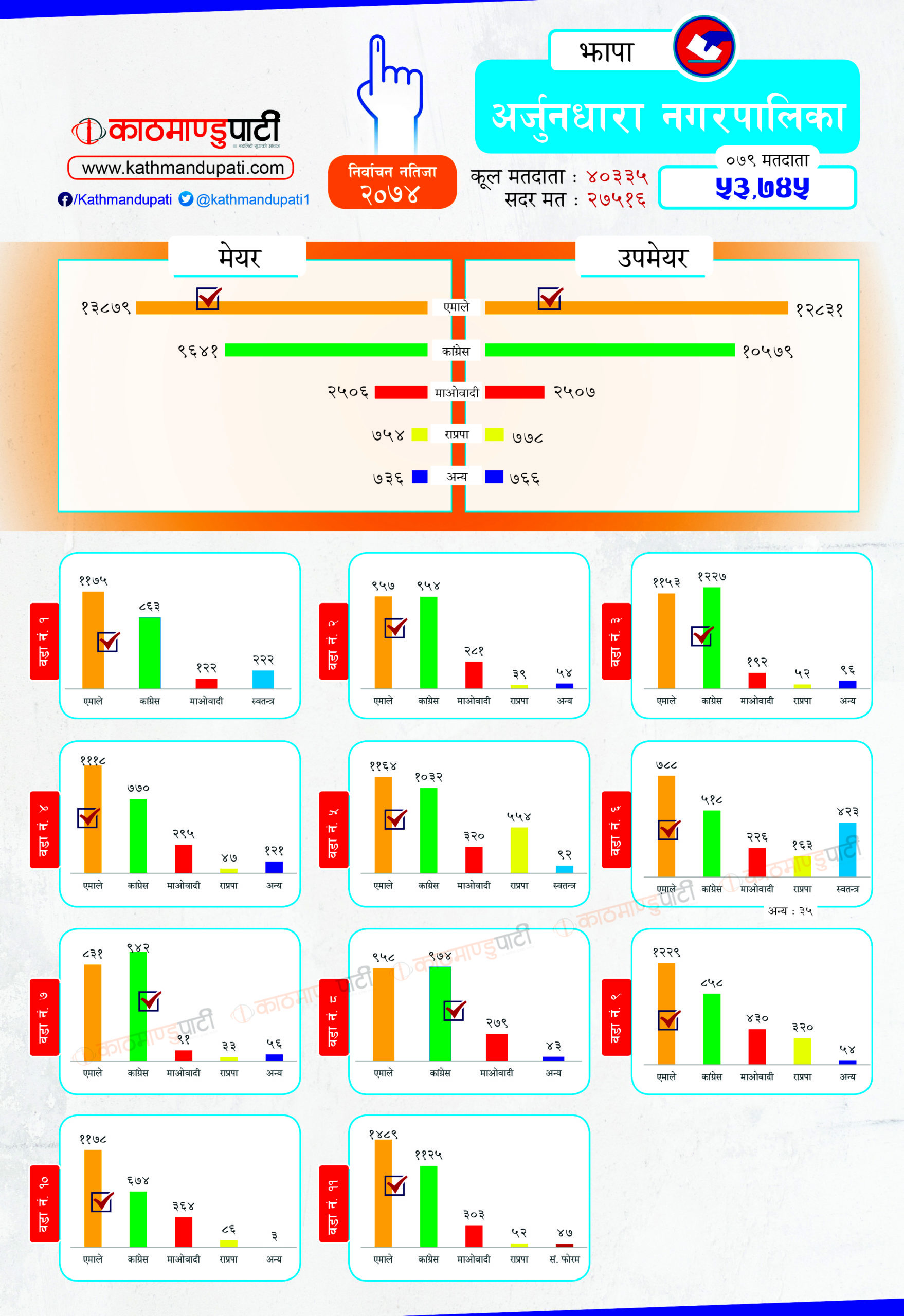 कांग्रेसले गौरादह नगरपालिका, झापा गाउँपालिका, बाह्रदशी गाउँपालिका, बुद्धशान्ति गाउँपालिका र मेचीनगर नगरपालिका जितेको थियो भने कचनकवल गाउँपालिका, गौरीगन्ज गाउँपालिका र हल्दीबारी गाउँपालिका राप्रपाले जितेको थियो । चौथो शक्ति माओवादीले कुनै पालिका जित्न सकेन ।